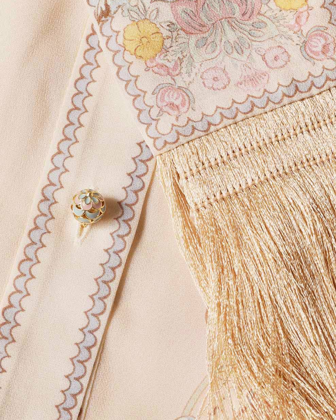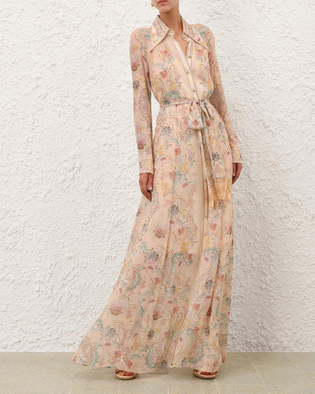 The Rebellion Pussybow Shirt Dress in Pink Floral from Cruise 2026 Collection, Twisted Romance. A long sleeve maxi dress featuring a classic collar with pussybow necktie and buttons down the centre front