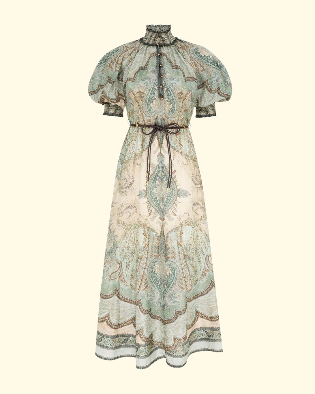 The Wanderlust Billow Dress in Tapestry Teal Multi from Zimmermann's Resort Swim 2026 Collection. A silk maxi dress featuring a shirred stand collar, short billowed sleeves, finished with functional side pockets and frill trim.
