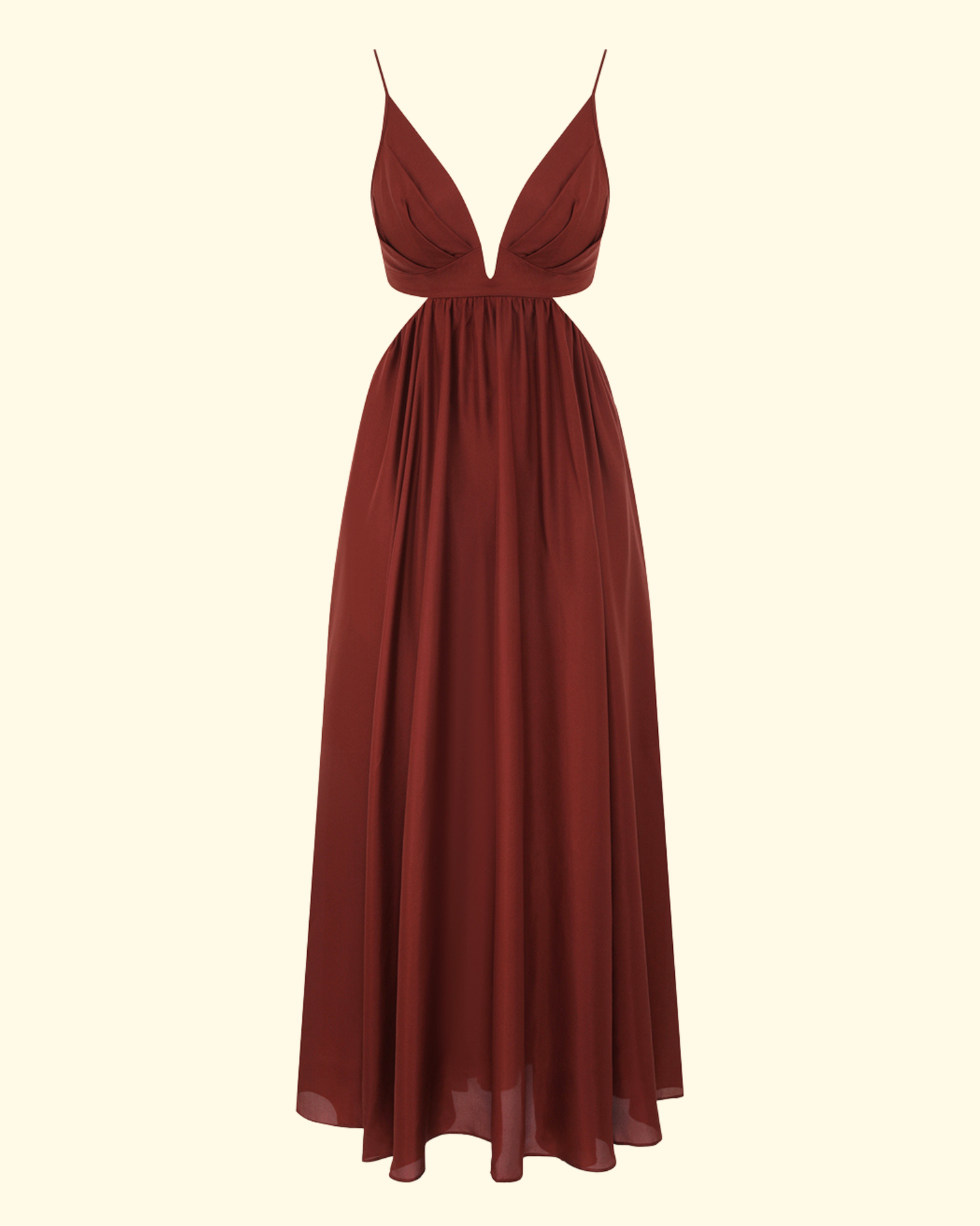 The Wanderlust Plunge Maxi Dress in Burgundy from the Resort Swim 2026 Collection. A silk maxi dress featuring a plunging V-neckline, ruching at the bust, adjustable straps, side cut-outs, elasticated lower back, finished with an invisible zip closure, functional side pockets and heavily gathered skirt.