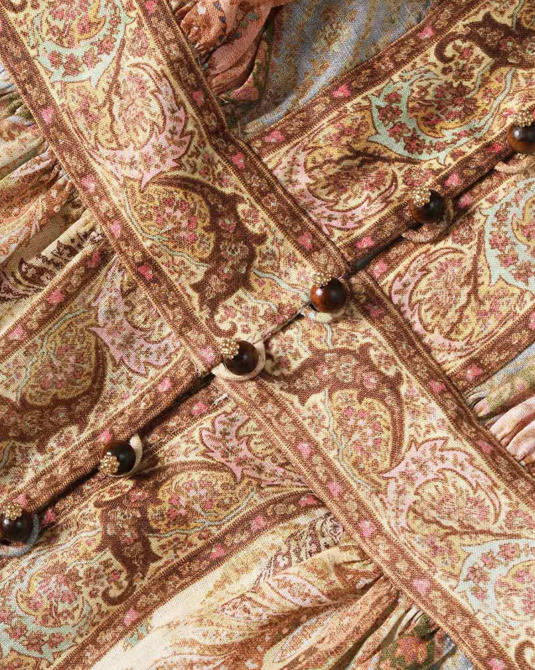 The Wanderlust Plunge Midi Dress in Tapestry Multi from Resort Swim 2026 Collection. A linen midi dress featuring a plunging V-neckline, long tubular sleeves with elasticated cuffs, finished with a fitted waistband and flared skirt.