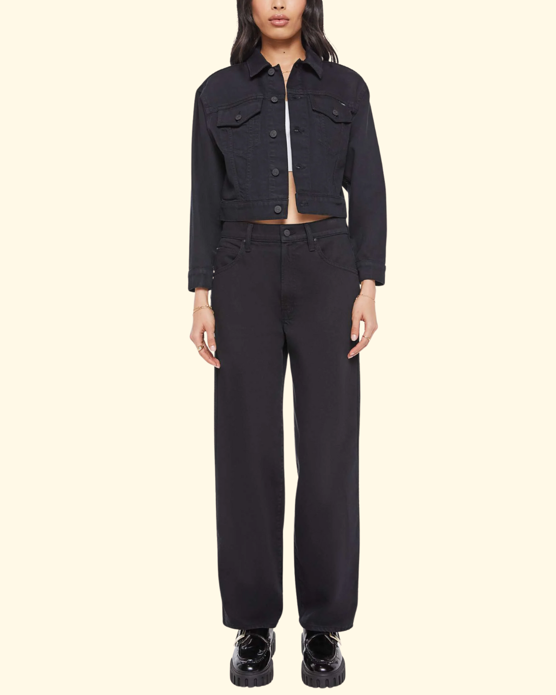 A shrunken denim jacket with drop shoulders, front patch pockets and a cropped fit. Made from rigid SUPERIOR denim, The Big Shorty in Pirate Black is designed in black with tonal hardware.