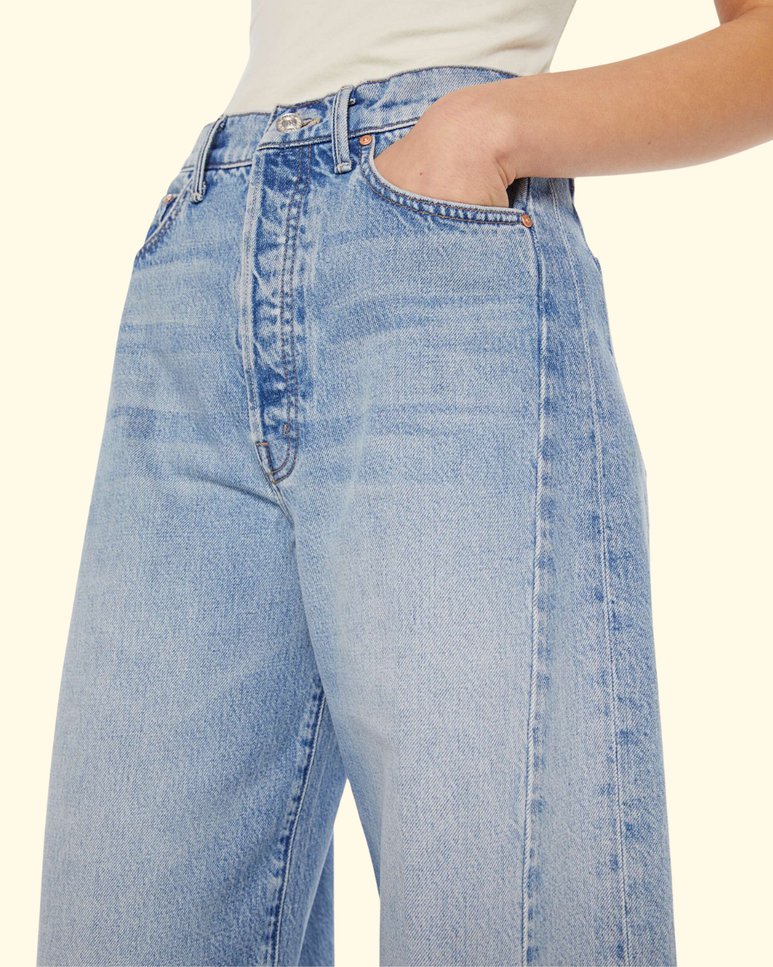 Super high-waisted barrel-leg jeans with a long 31-inch inseam, button fly, clean hem and relaxed fit. Made from rigid SUPERIOR denim, Leap At The Chance is a light blue with whiskering and fading at the knees.