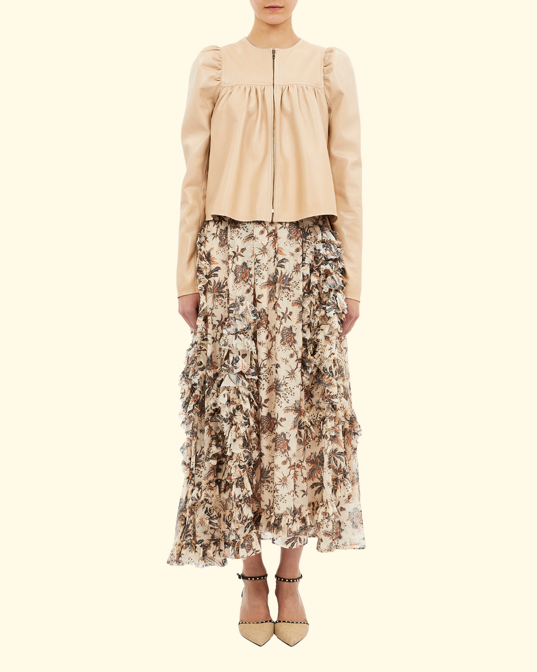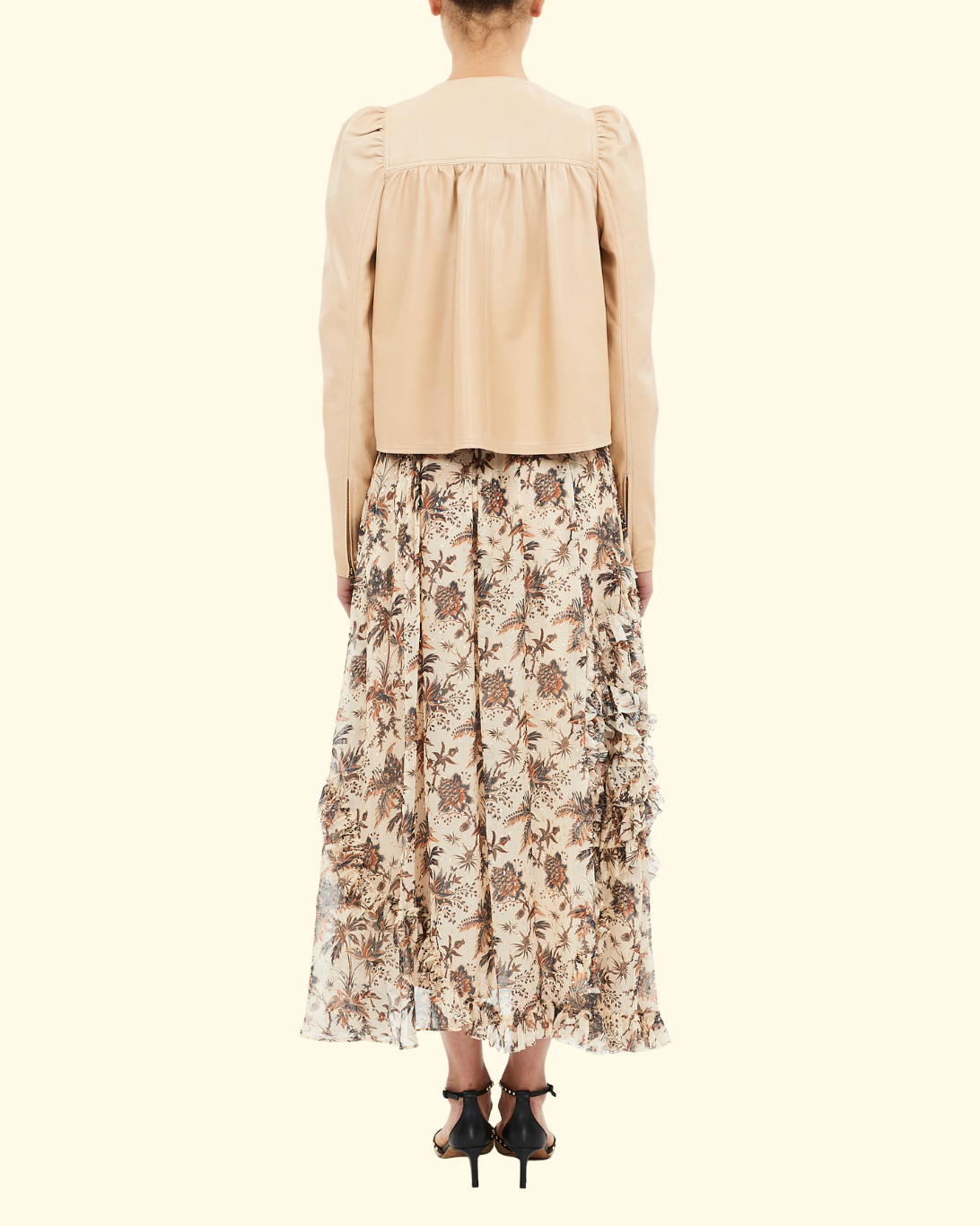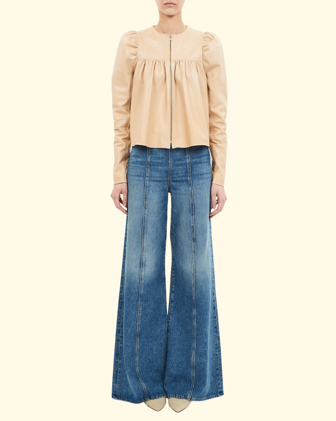 The Anouk Jacket is expertly tailored from leather with subtle paneling and gathers for elegant structure. Framed by signature puff sleeves, this wardrobe heroine has a clean, collarless neckline and arrives in light brown for endless versatility.