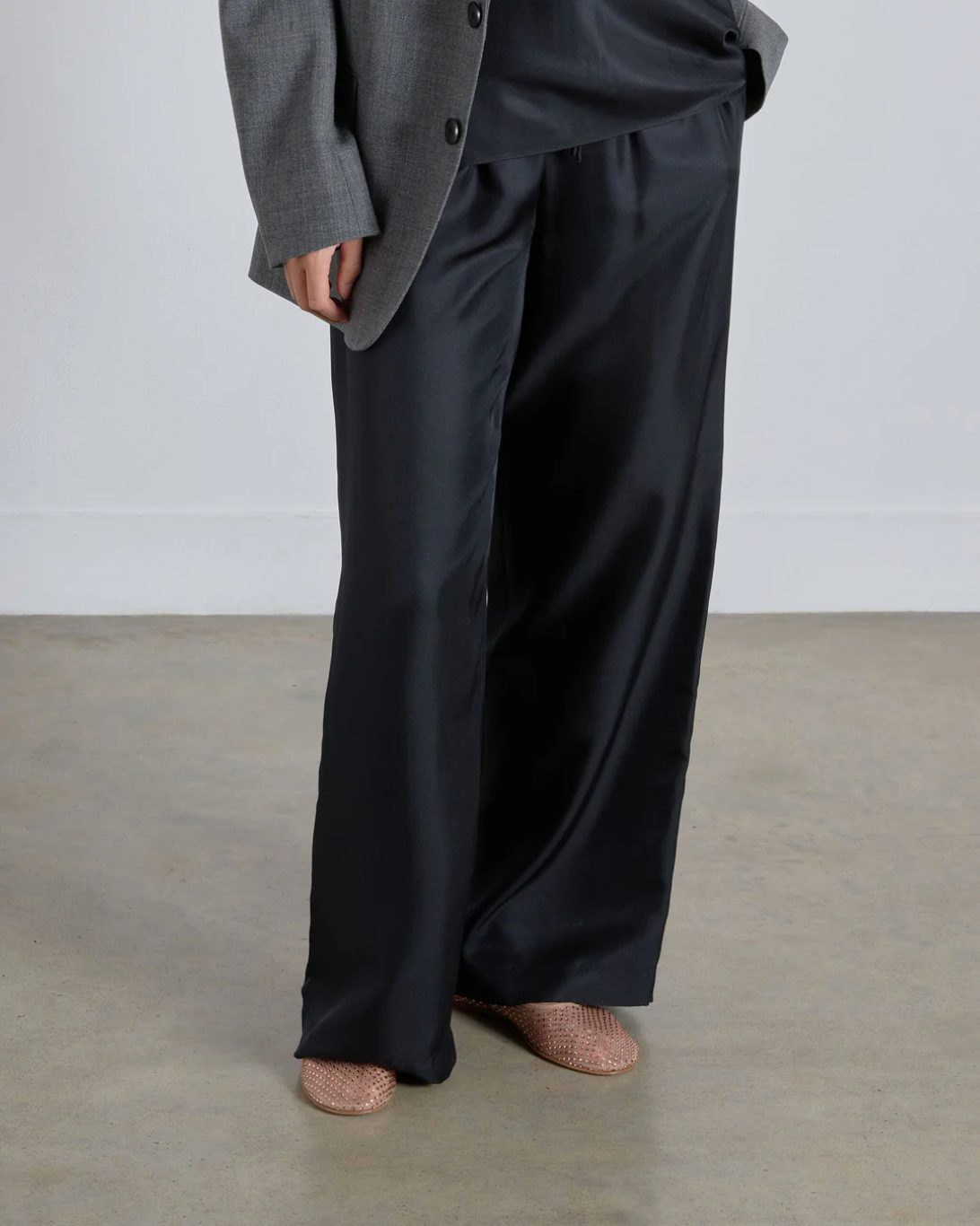 A modern ballet flat in sheer mesh, hand-detailed with a fine tonal crystals. Leather wrapped and padded insole, buffed leather outsole and flat stacked cuoio heel.