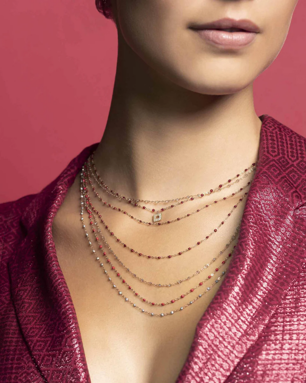 The Classic Gigi necklace by gigi CLOZEAU features 18 carat Yellow Gold, and striking Bordeaux jewels for an everday effortless appearance.