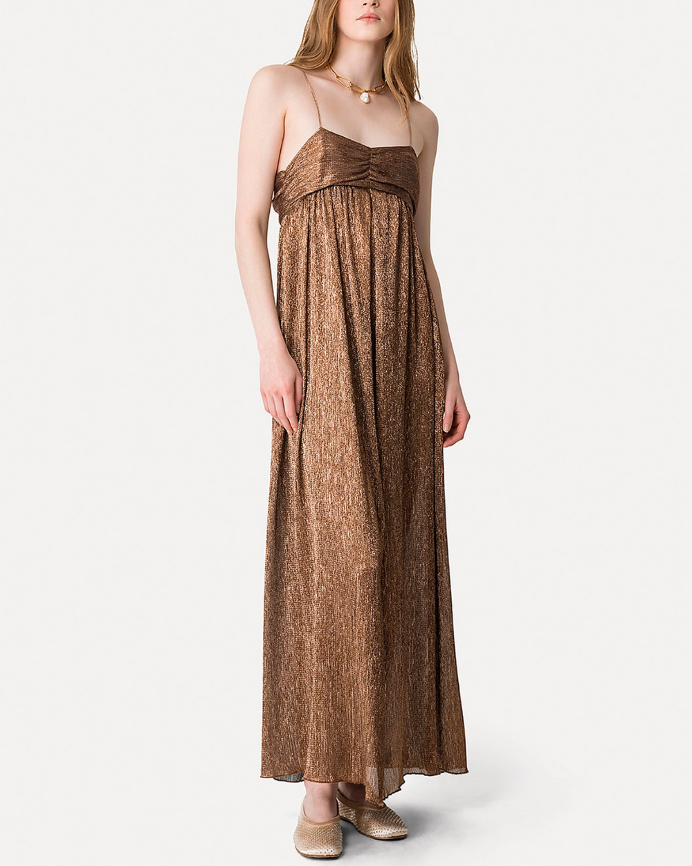 Falling to an evening–appropriate length, the elegant gown with froissé lamé leaves the shoulders bare and swathes the bust in a gently gathered bandeau bodice. The soft crépon is shot with glistening metallic yarn while the uneven fabric texture lifts the design with an ethereal feel.