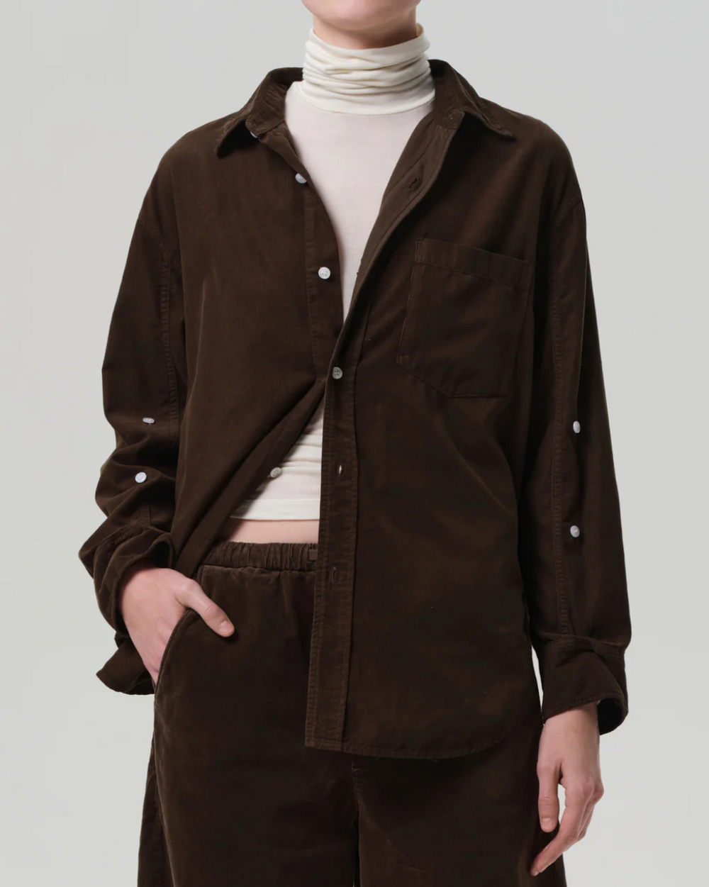 The Kayla Shirt is a timeless button-up reimagined in lightweight baby corduroy with a soft, velvety hand. Designed with a relaxed silhouette and full-length sleeves, it drapes effortlessly for a laid-back yet polished feel. Wear it tucked, layered, or left loose for versatile everyday styling.