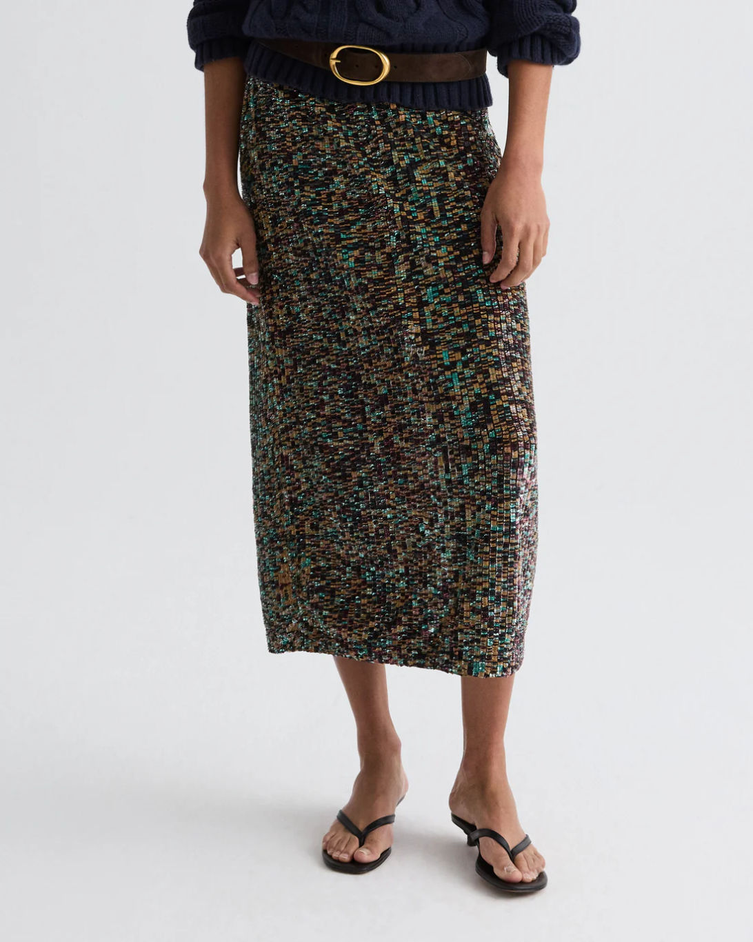 Mid-rise straight-cut skirt embellished with multicolored abstract sequins. The Sylkie falls to a midi length with a center-back slit. Half lined in silk charmeuse and finished with a concealed side zip closure.
