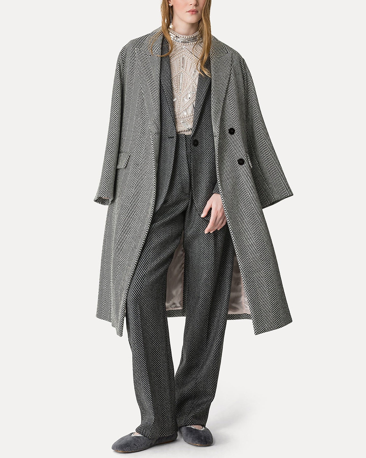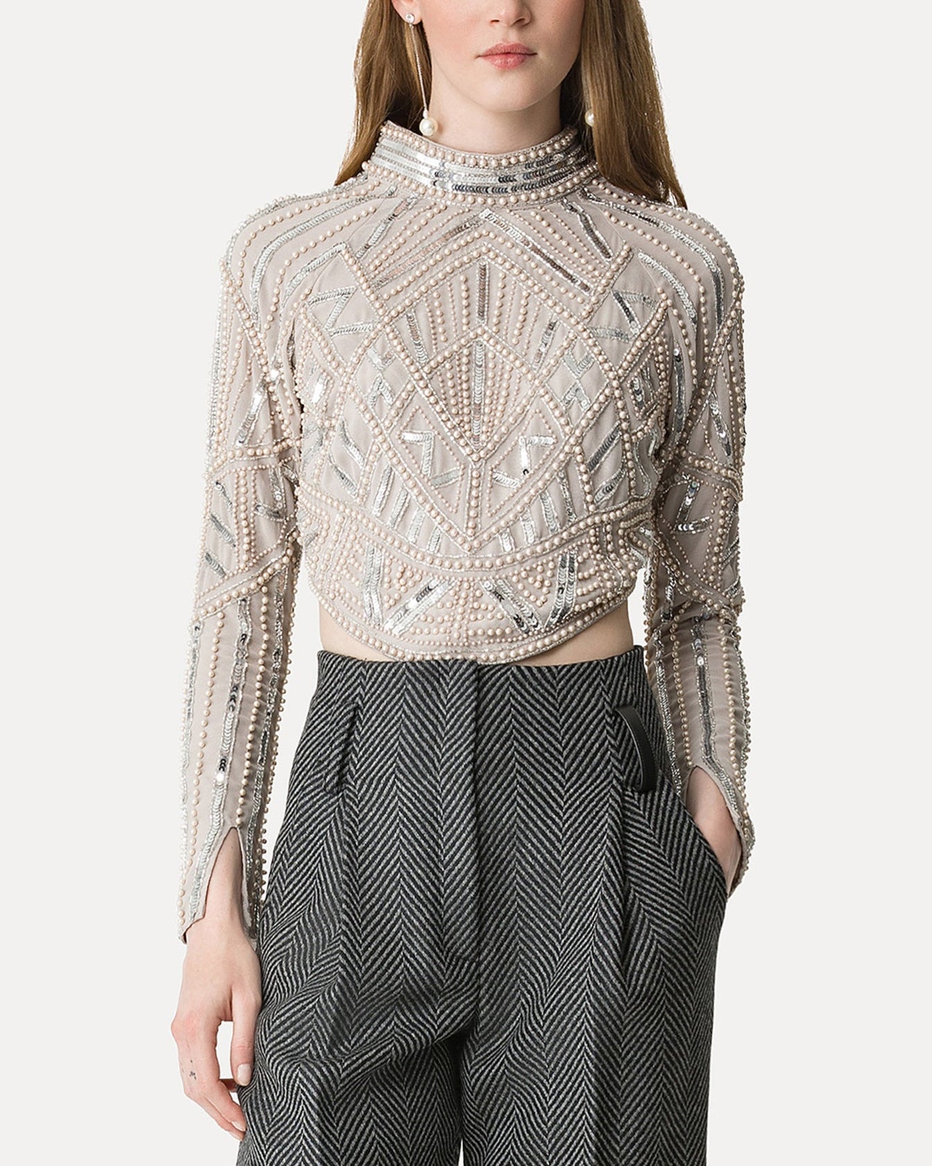 As light as a morning breeze and intricately hand–stitched, the shirt with a funnel collar and “enchanted pearls” embroidery exudes an aura of beauty. Pearls and sequins gleam and flit on the georgette, catching the light and creating mysterious geometrical patterning and a subtly sensual effect. It fastens with covered buttons and has a curved hemline that is longer at the back.