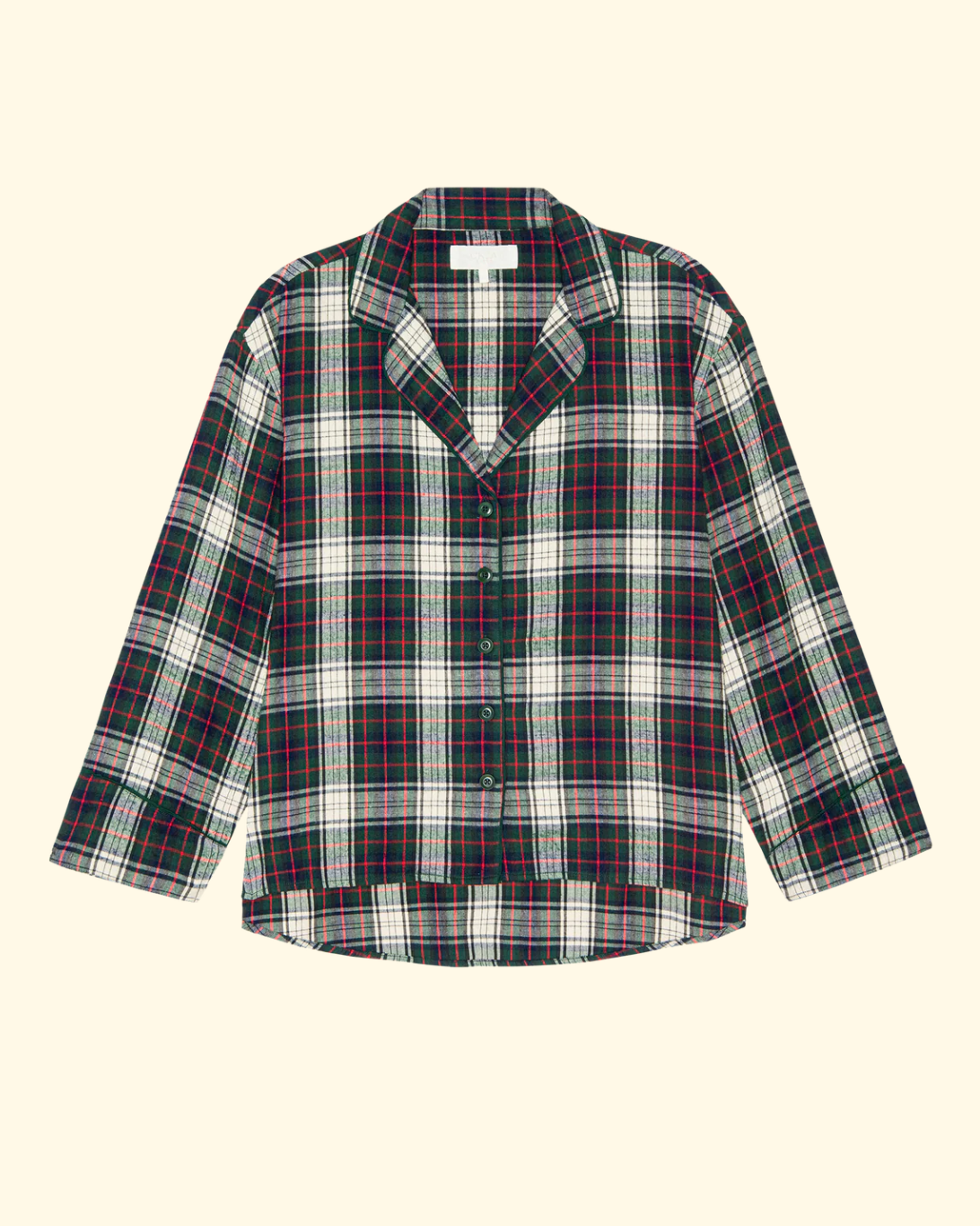 Made for cozy moments at home, The Flannel Pajama Top. references men’s vintage pajama tops that we’ve always loved to borrow. Roomy and drapey, it features an open neckline, button front, and nostalgic sleepwear details. Made from the softest cotton flannel in our Pine Lodge Plaid and trimmed with piping, it pairs perfectly back to The Flannel Easy Sleep Pant. for a coordinated set.