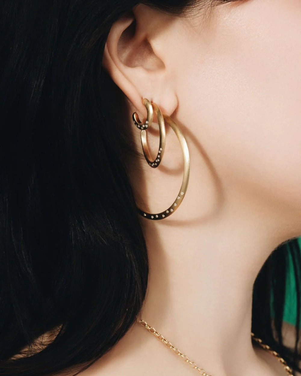 Made with buttery, knife edged 18-karat gold and scattered with diamonds, the Ophelia hoops offer a subtle sparkle that catches the light with every movement. Versatile and timeless, the Ophelia Hoops are the perfect companion for everyday moments - graceful standing alone or within your stack.