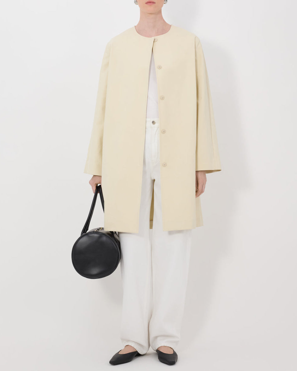 This coat is made of light cotton gabardine. It features a knee-length hemline and a straight, ample fit enhanced by a deep pleat on the back. Its softly rounded outlines, hidden button placket and collarless neckline create an assertive yet airy, delicate silhouette.