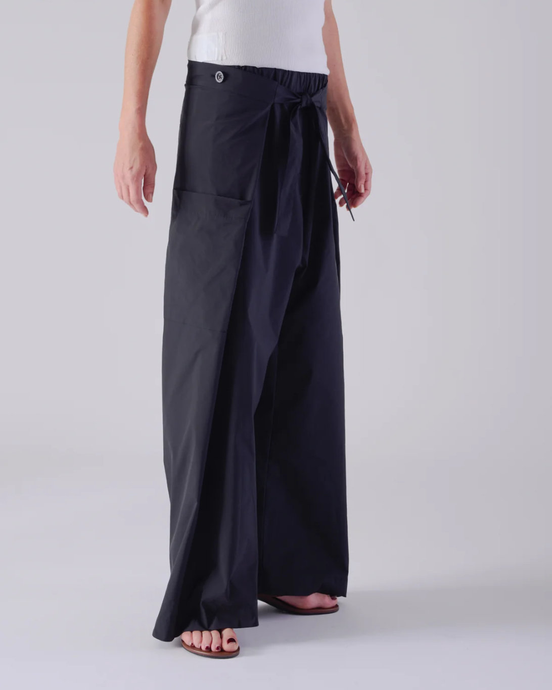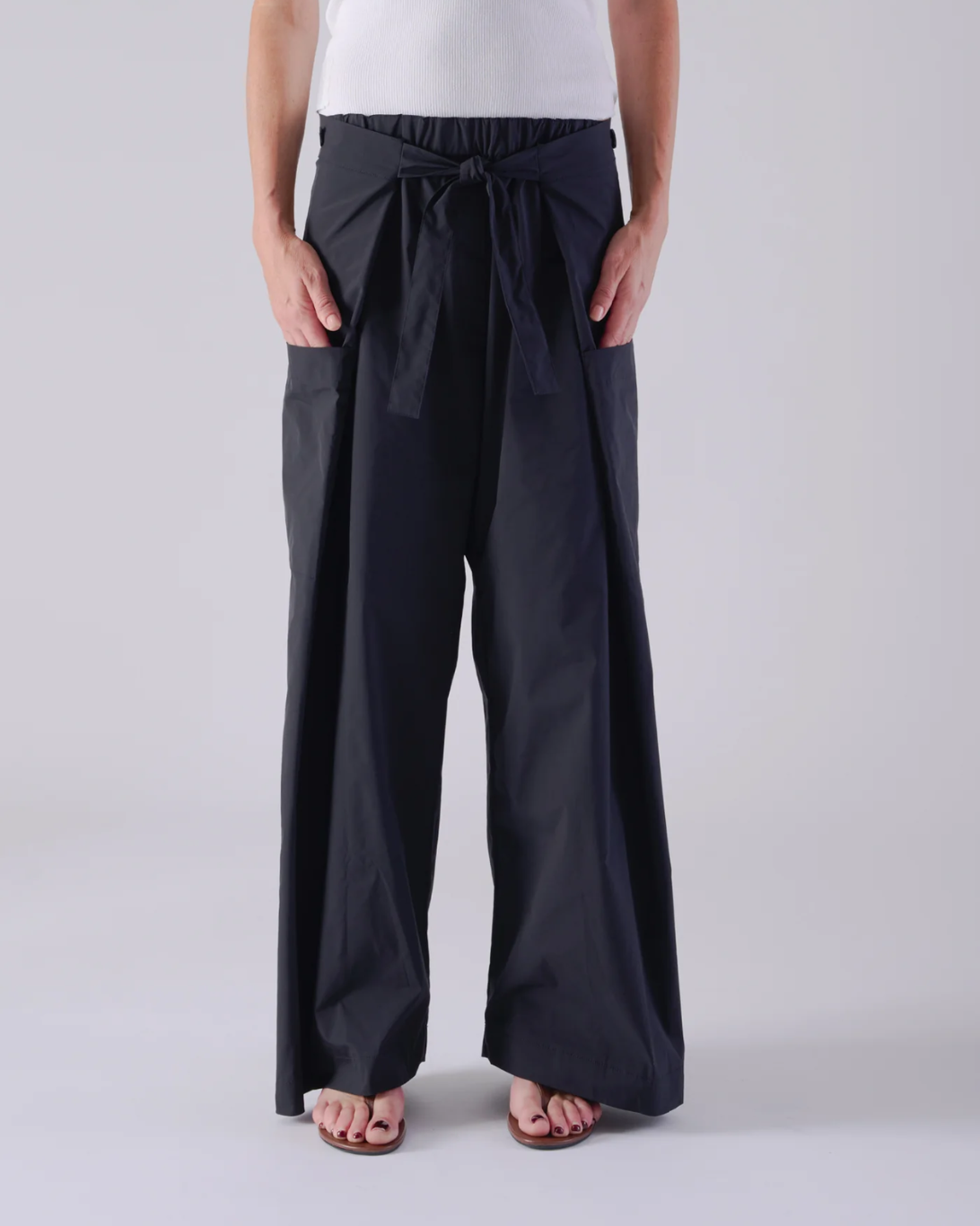 A stylish trouser featuring a super-oversized waist with a sash belt that is tied at the centre of the front and worn as if wrapped around the body, creating an unexpectedly elegant silhouette.