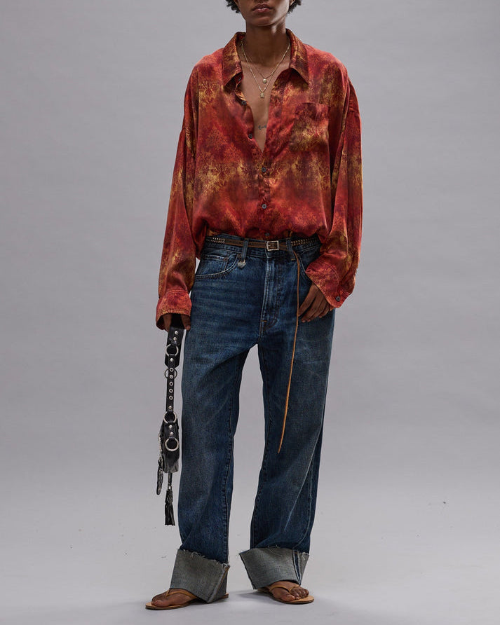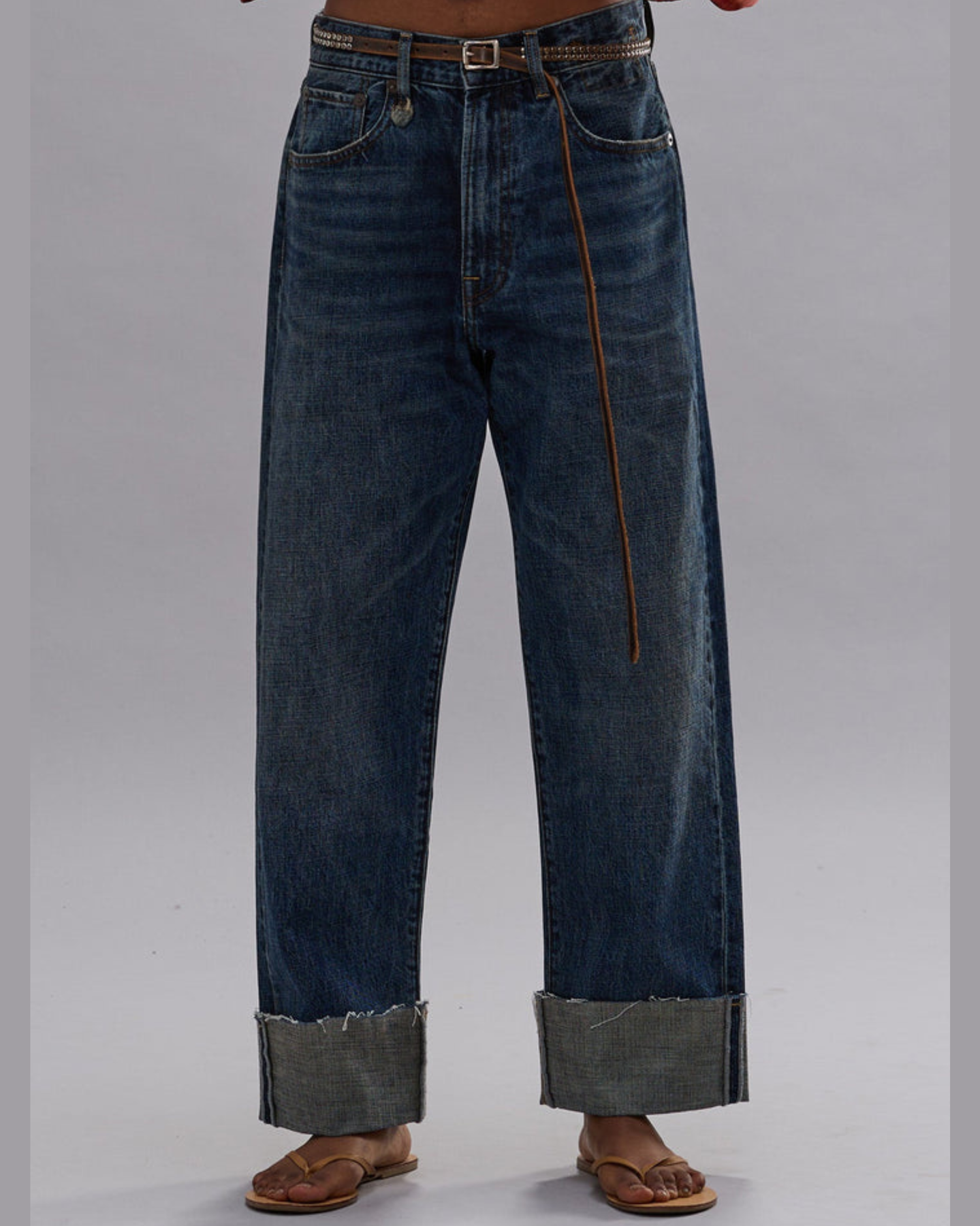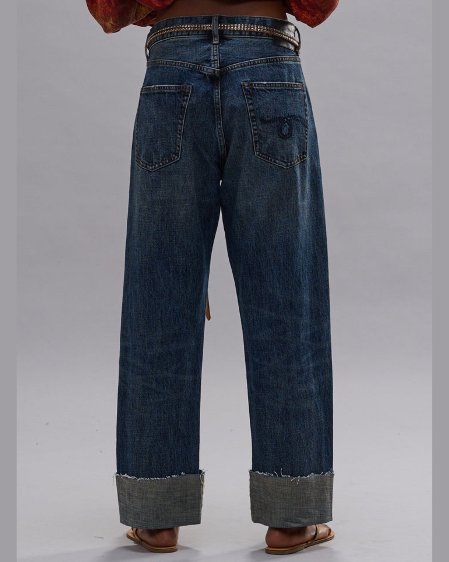A twist on R13's classic boyfriend jean with a wider, slouchier leg. Built with 13.5 oz. Japanese denim with a dark indigo wash and mild wear pattern.