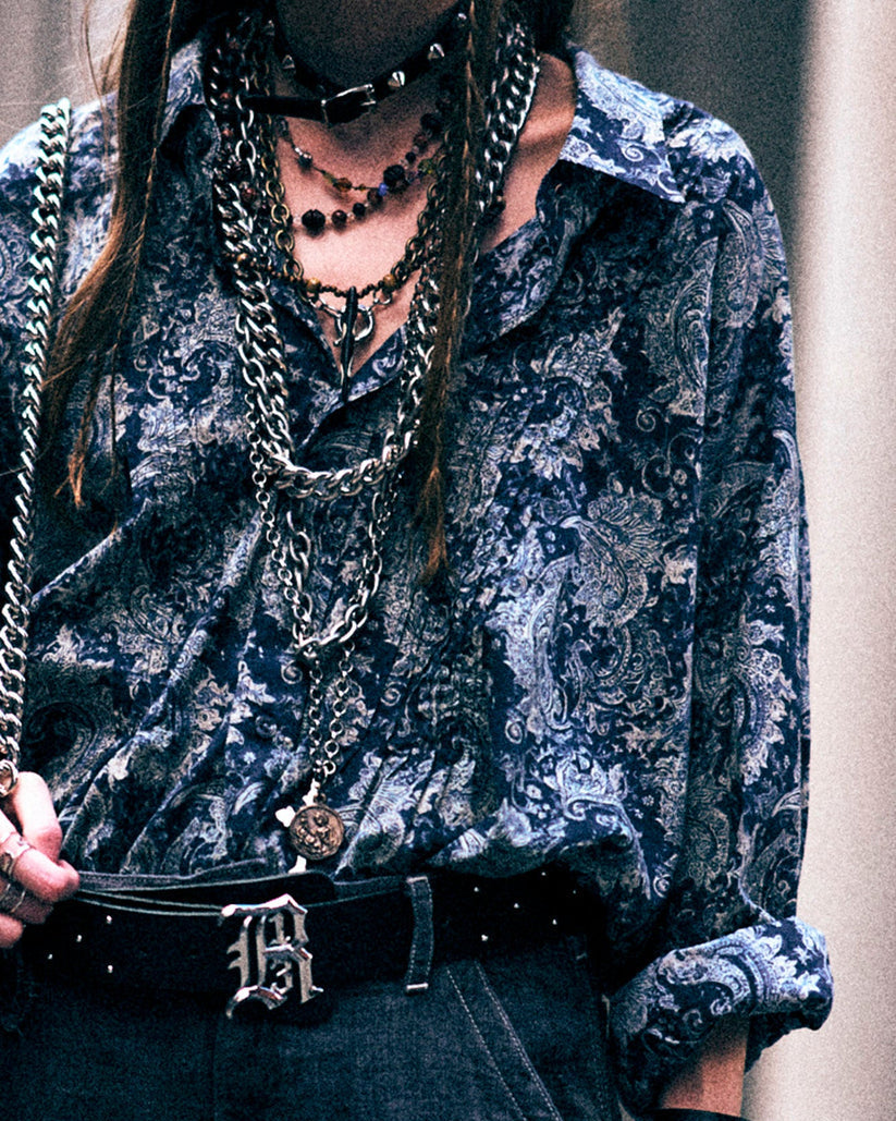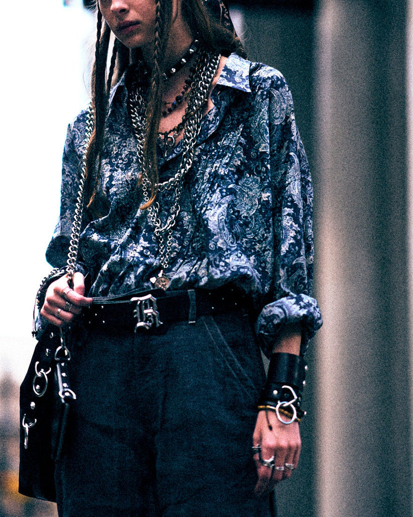 Button up shirt with pintuck detailing at the placket featuring an indigo paisley print.
