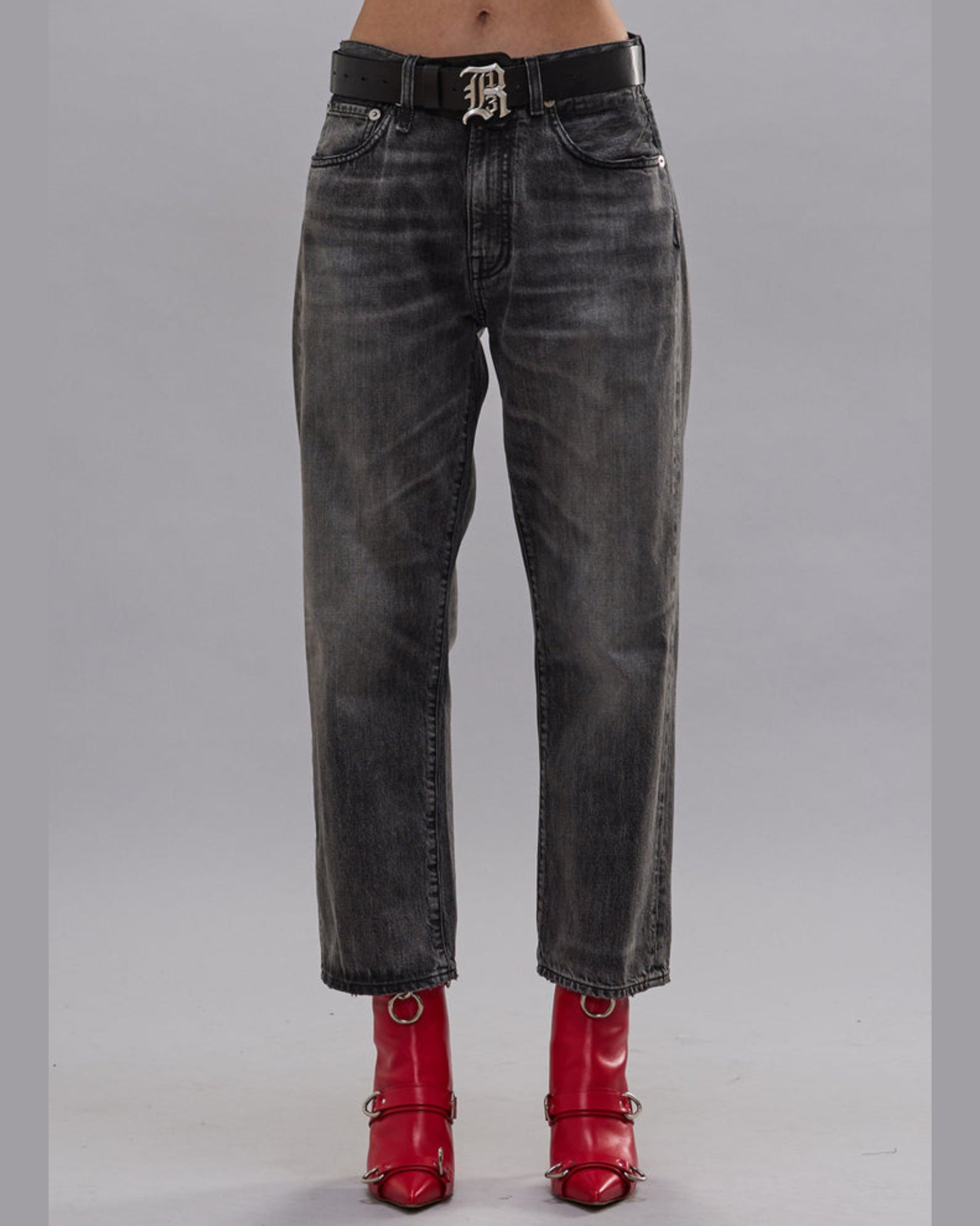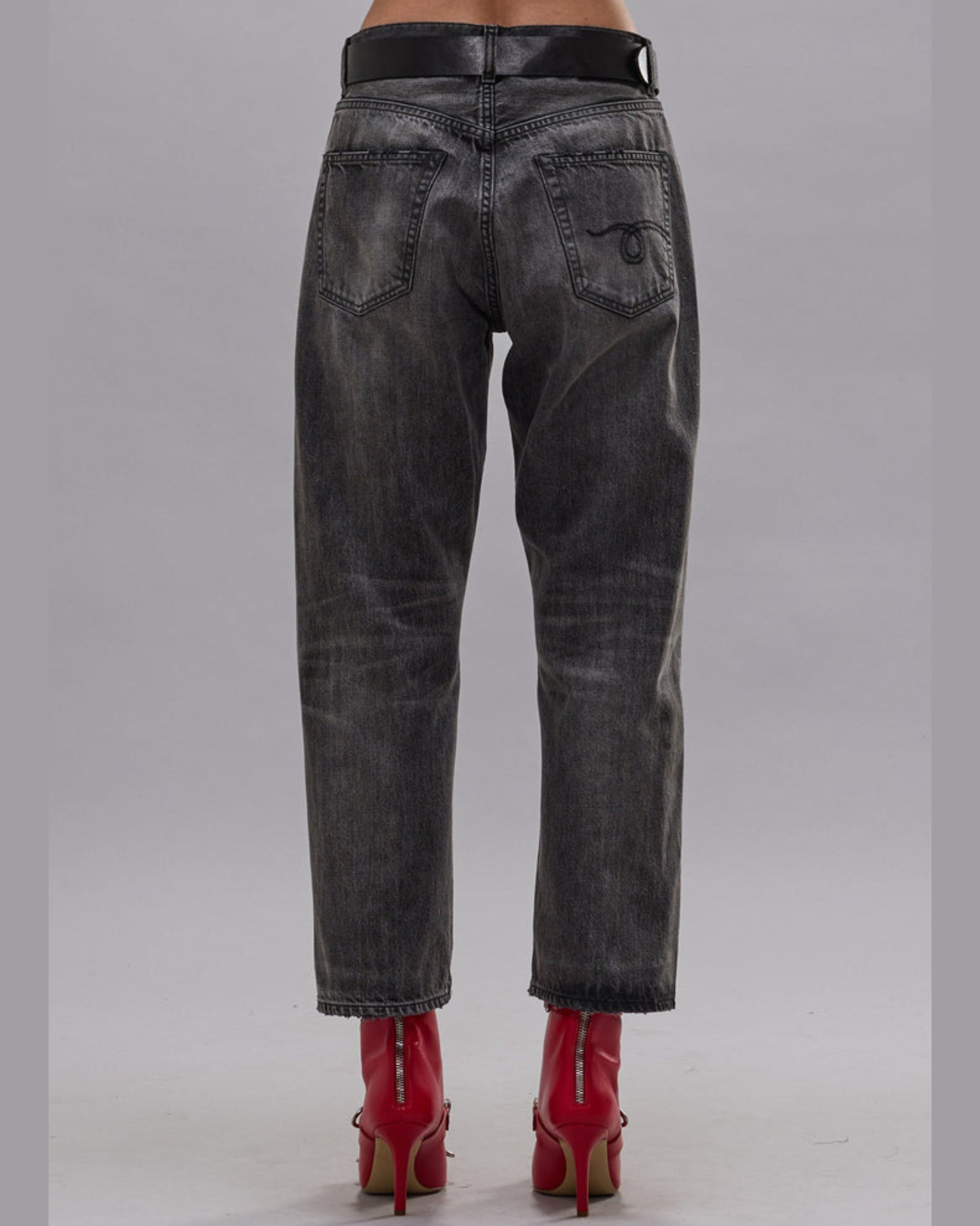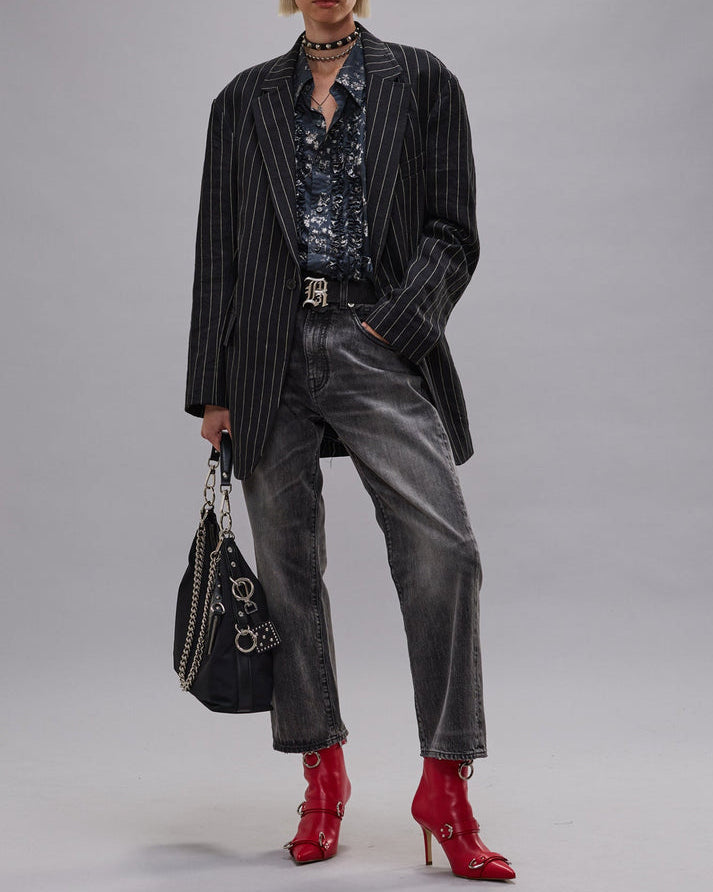 A twist on R13's classic boyfriend jean with a wider, slouchier leg built with rigid black 12.5 oz denim and a mildly worn wash.
