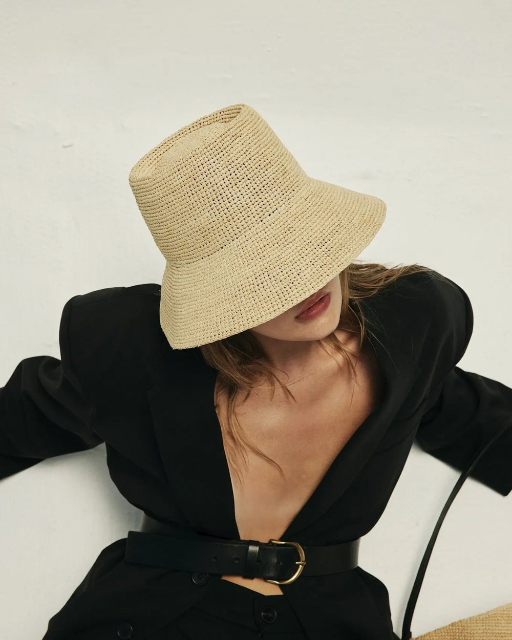 Crocheted raffia straw bucket hat that offers UPF 20+ sun protection, ensuring 99.9% of UV rays are blocked. The Felix's durable + flexible straw makes it packable and perfect to travel with