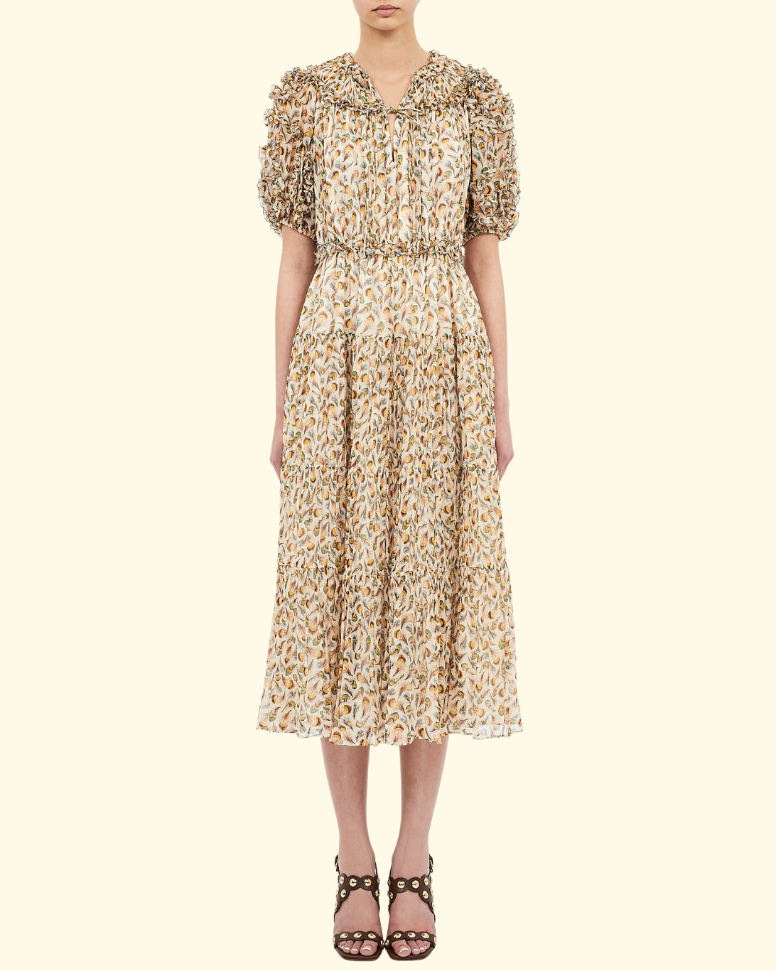 Ethereal in form, the Nan Dress is made from whisper-light crinkled chiffon in a soft hue. It is richly decorated with ruffles along the neckline and sleeves, before transforming at the skirt into floaty, gestural tiers.