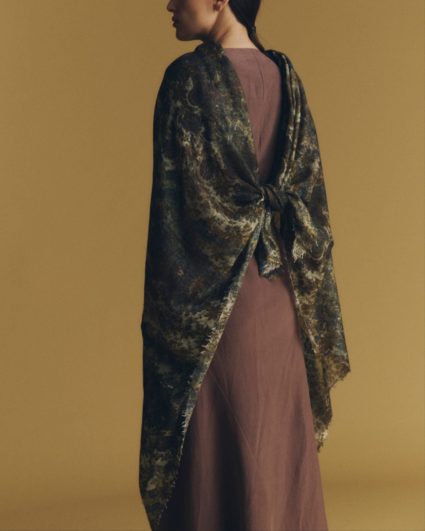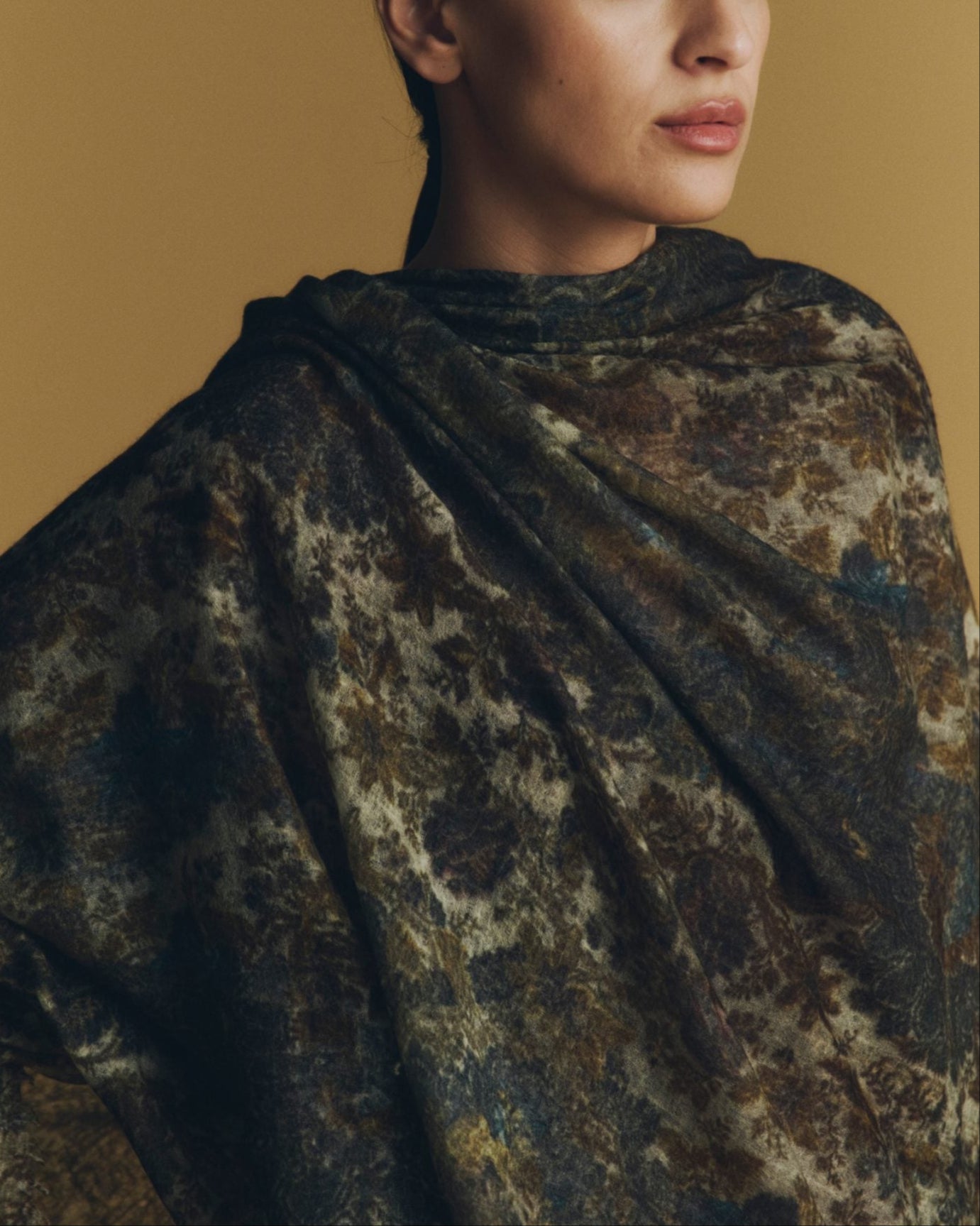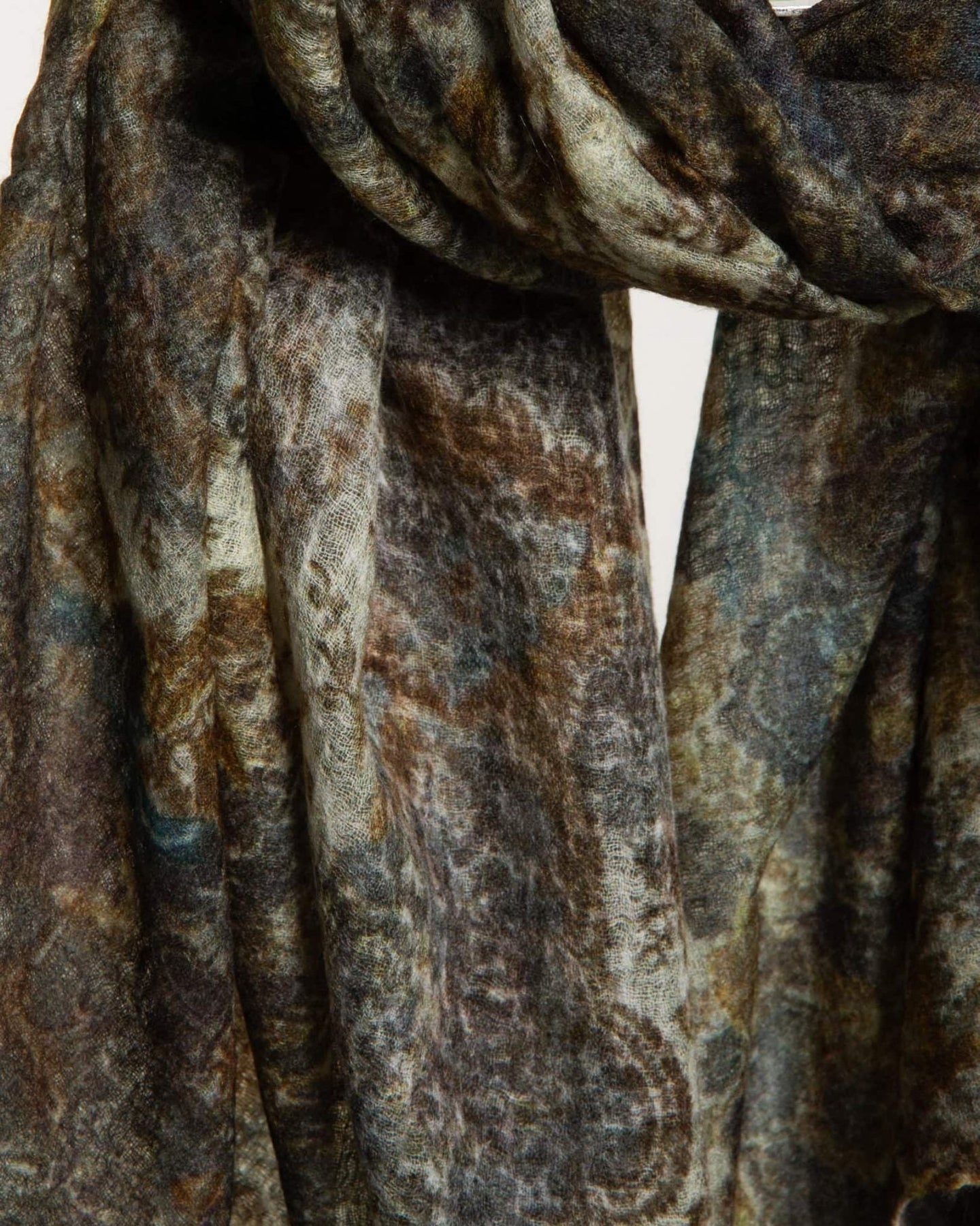 Featherlike, semi-felted cashmere shawl infused with antique textile artistry.