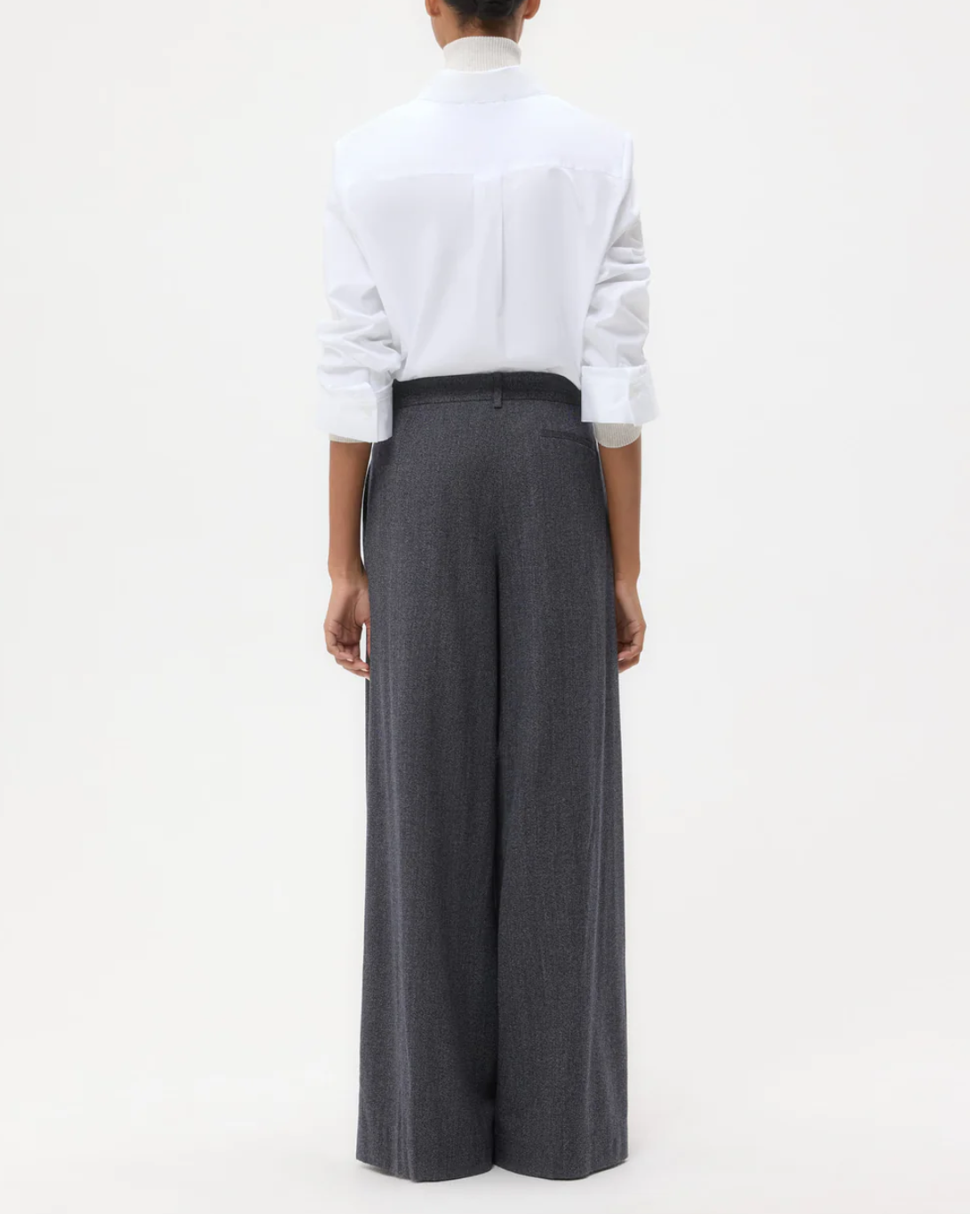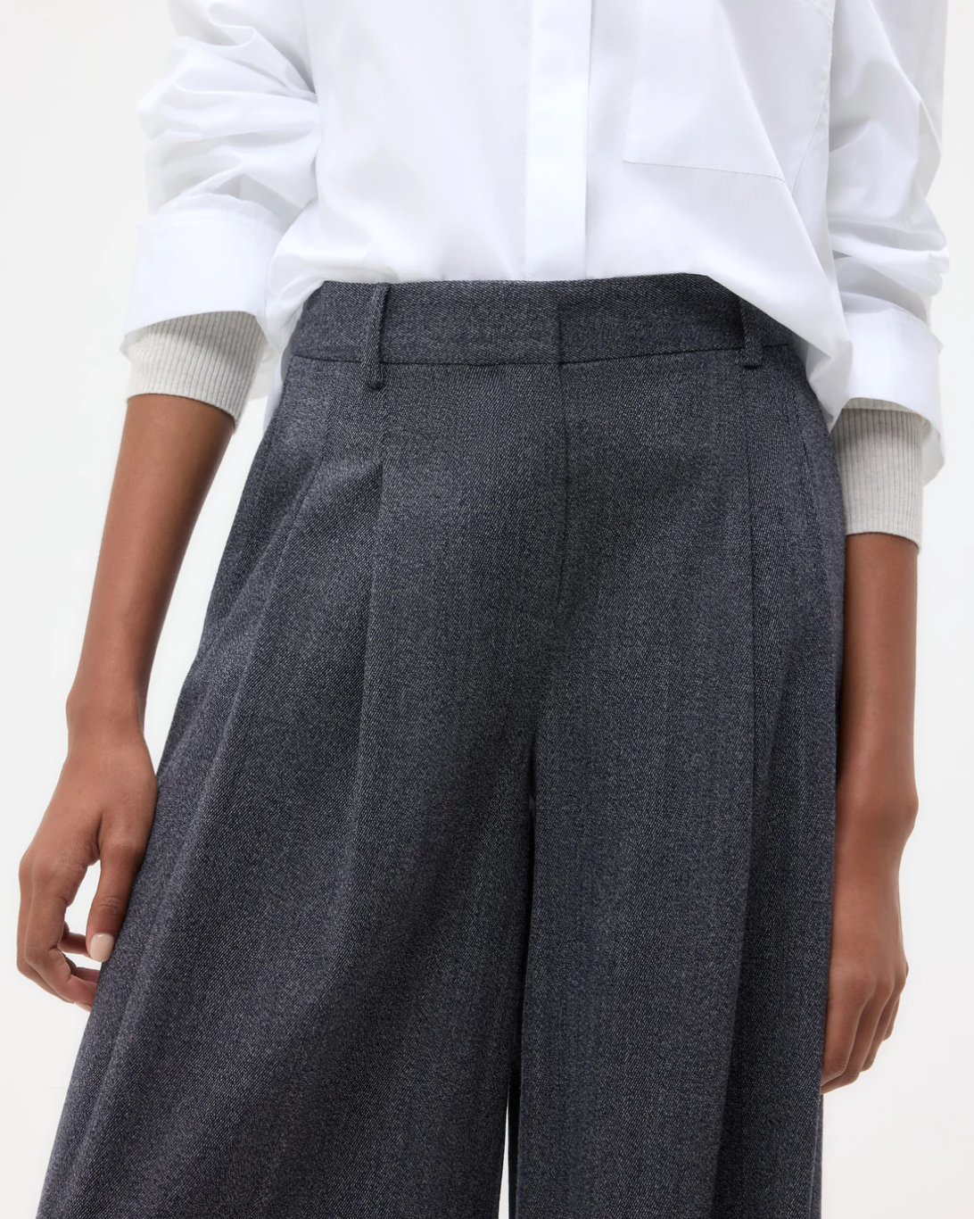 Mid-rise, pleated pants in stretch wool. Fabric is viscose/wool blend with a touch of stretch for comfort. Relaxed, wide leg silhouette. Complete with side pockets, a zip-fly, belt loops and hook and eye fastening at the waistband.