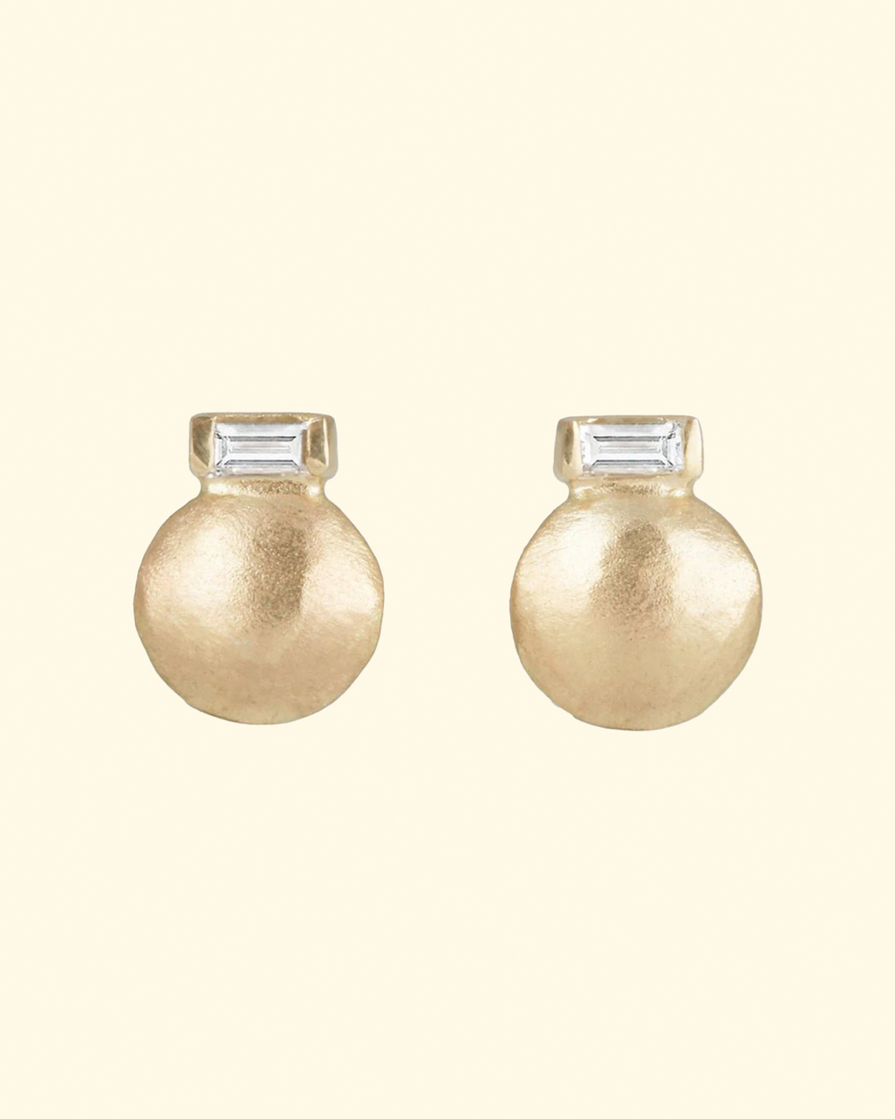 These contemporary studs combine a satin finish dome of 14k yellow gold with a streamlined diamond baguette to create a uniquely wearable stud.