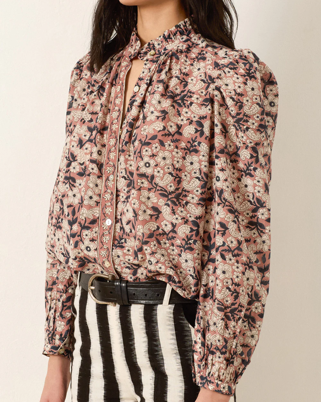 Annabel Sepia Floral Shirt by Alix of Bohemia made in old pink cotton with a white and black floral print. A feminine blouse with a gathered round neck, long sleeves tightened at the cuffs and a white mother-of-pearl button placket.