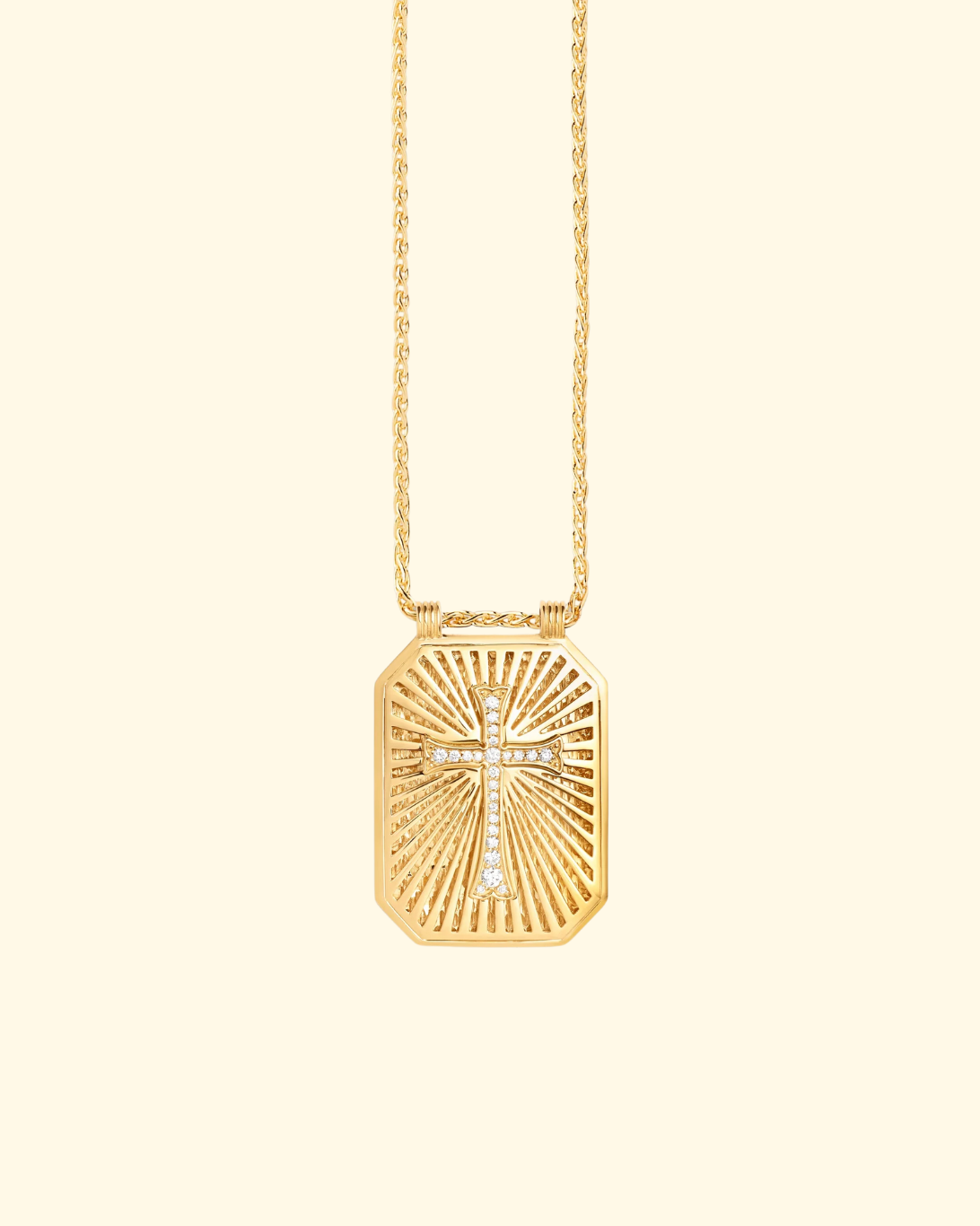 Medium yellow gold scapular, adorned with a cross set with white diamonds and a diamond on the back.