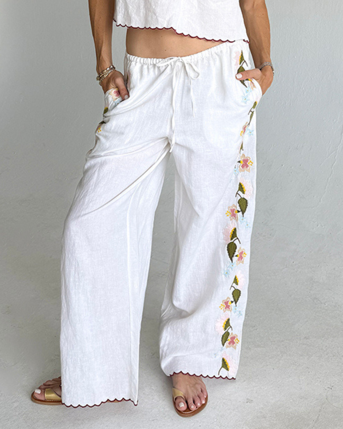 The Ermanno Pant in White is a women’s wide-leg linen pant featuring embroidered flowers down the sides and an elastic drawstring waistband for a relaxed fit. Designed with side and back pockets, these lightweight white linen pant is both comfortable and easy to wear.