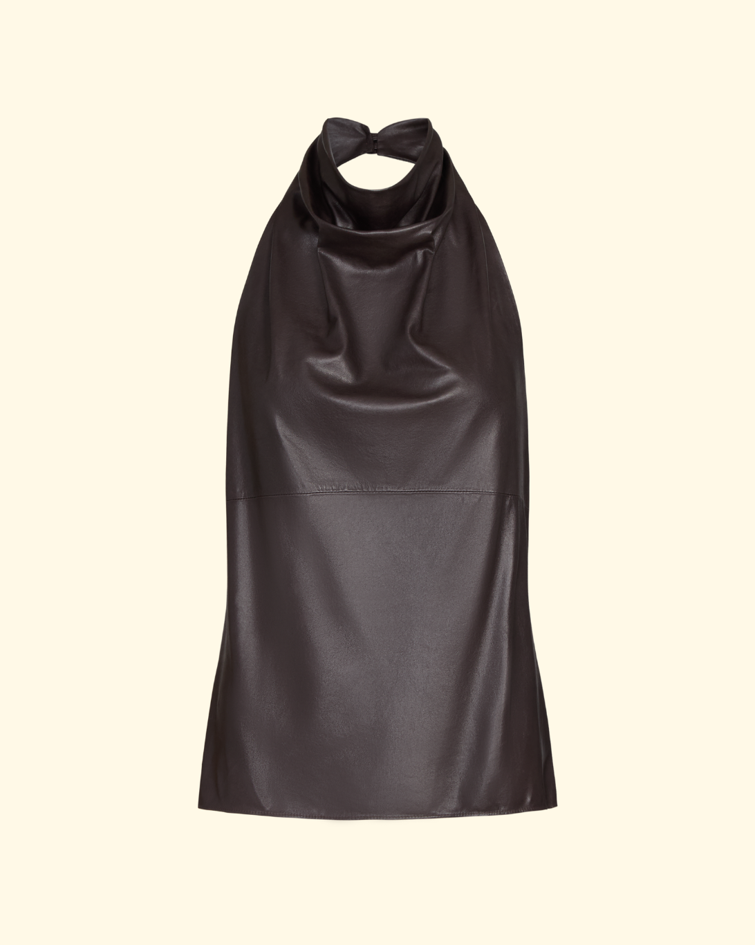 High-neck, backless top with a cowl neck in supple lamb leather finished on both sides. Loose, draped fit with a high cowl neck and open-back halter design. Complete with button closure at the neck.