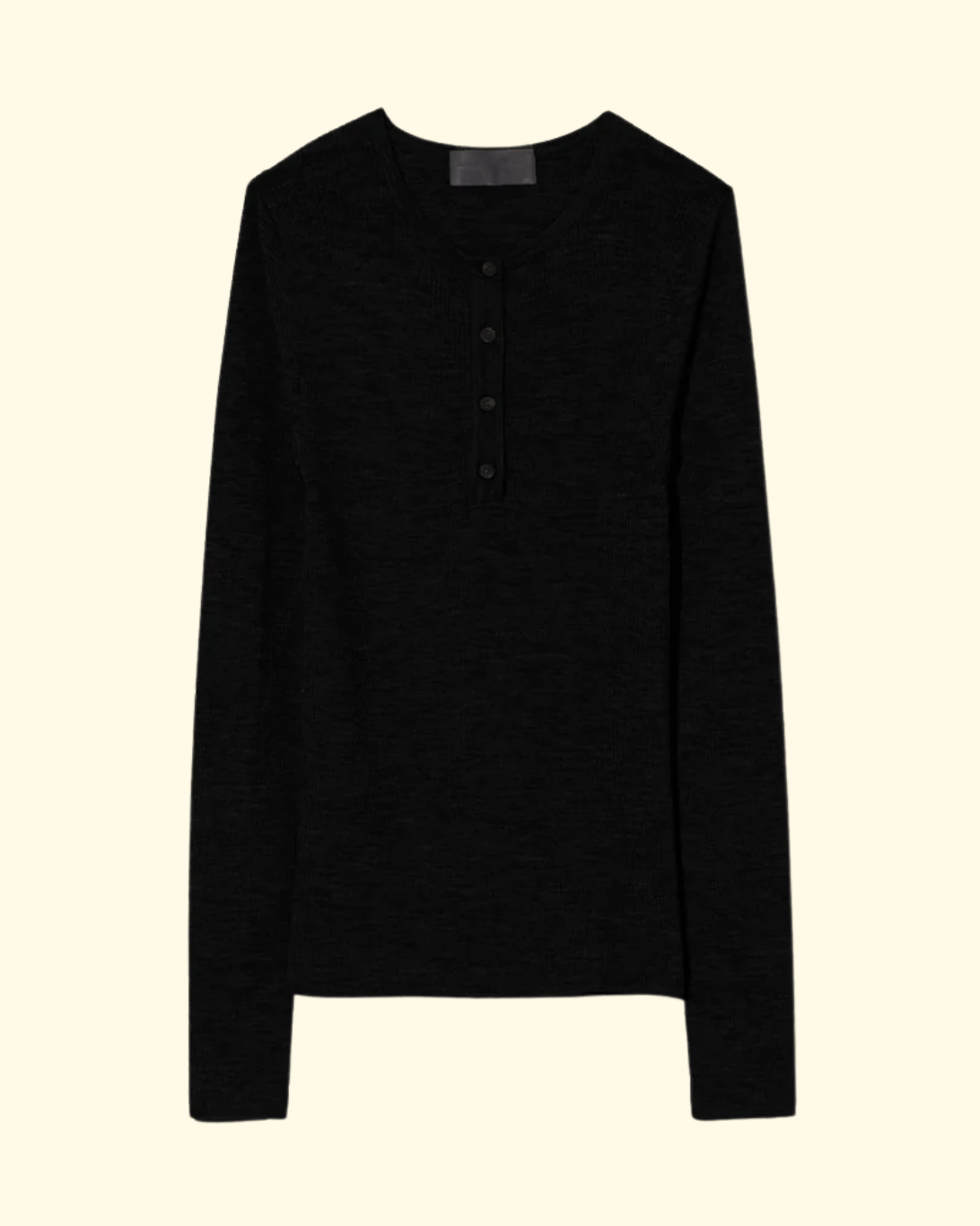 Slim fit fine gauge pullover long sleeve henley sweater in Italian merino silk blend. Regular length. Faux horn button closure. Tubular neck trim. Fashioning detail along arm hole and shoulder.