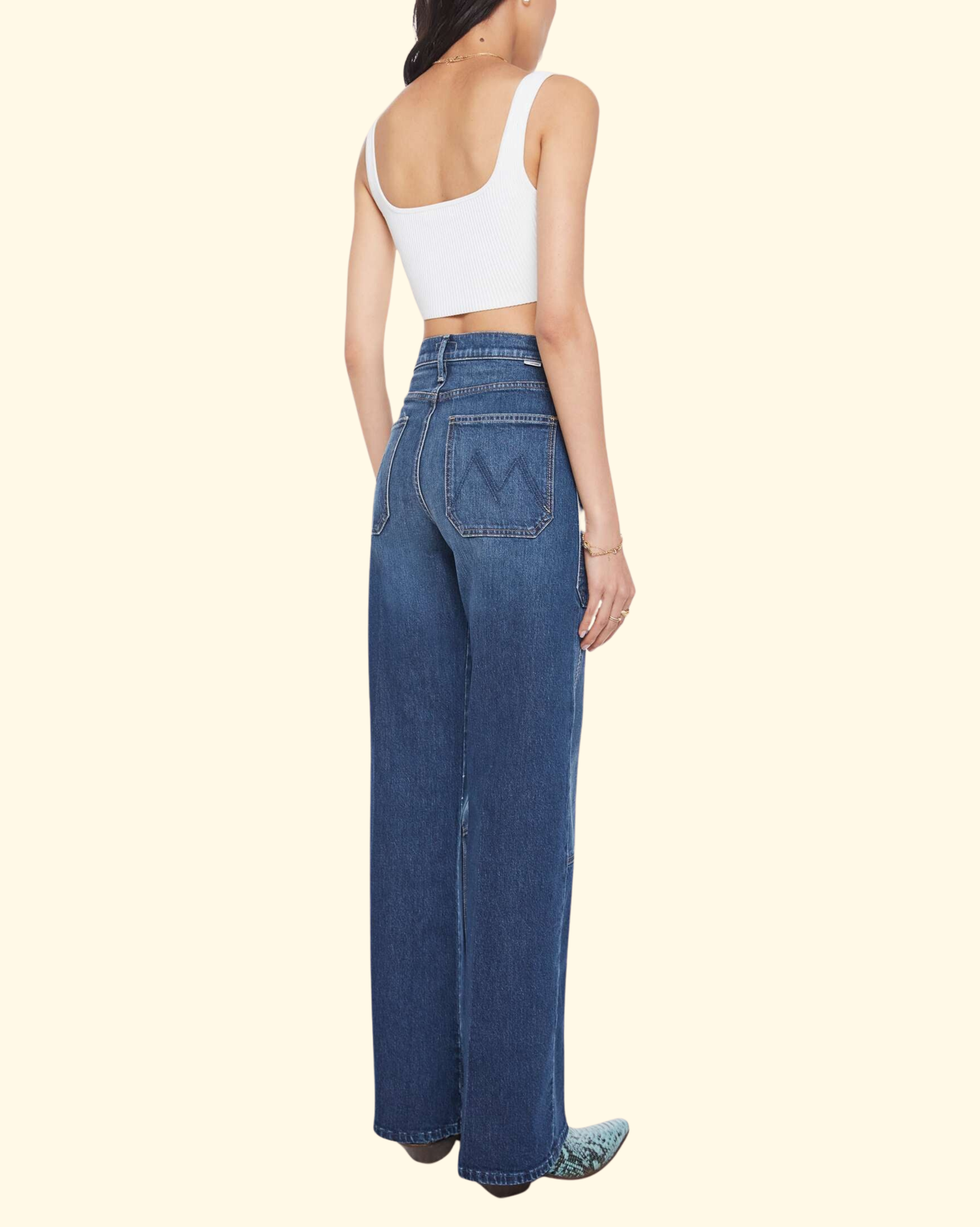 Star power. Wide-leg jeans with a super high rise, oversized front patch pockets, seamed details throughout and a long 32-inch inseam with a clean hem. Made from denim with a touch of stretch, Shine On is a dark blue with whiskering and fading at the knees.