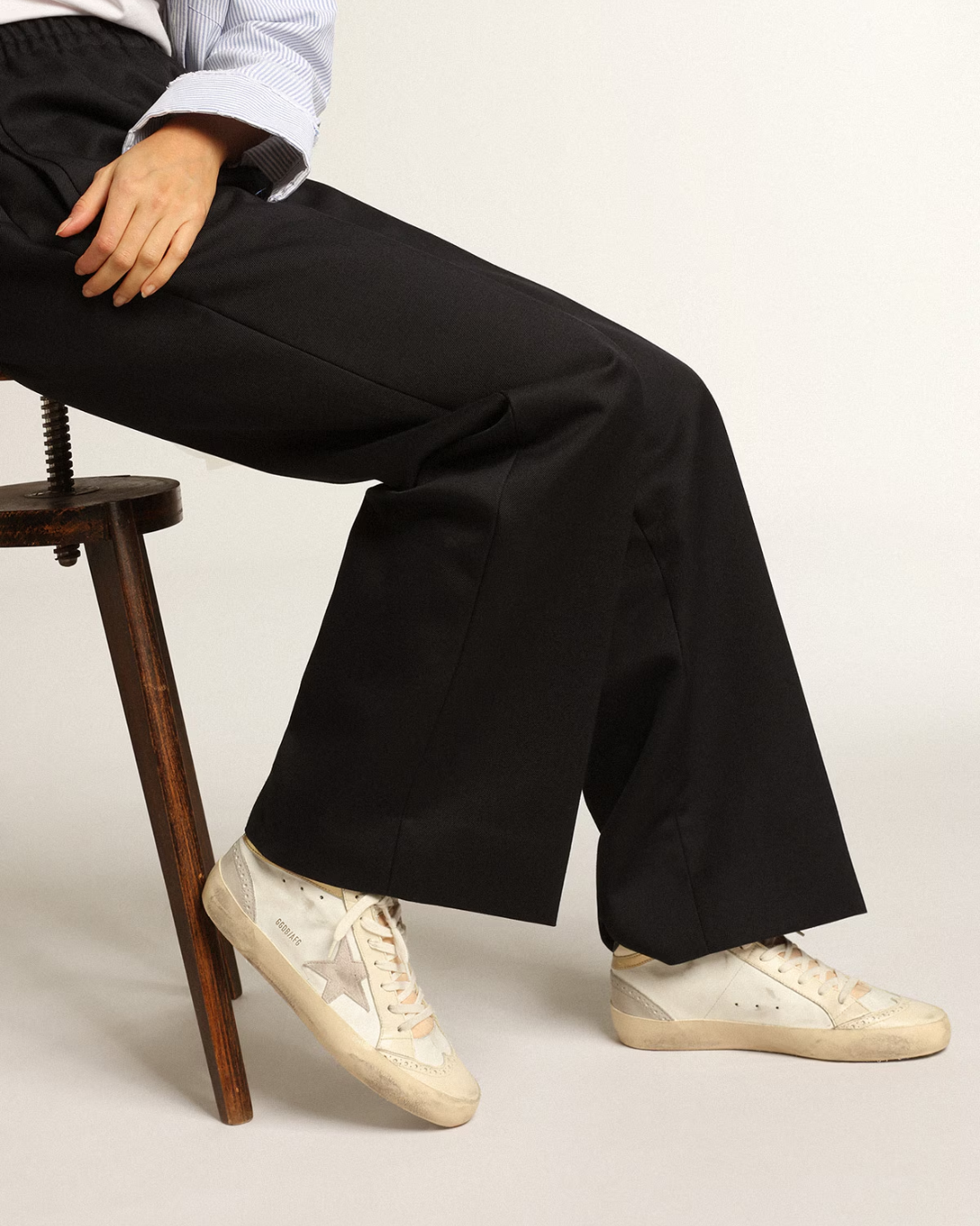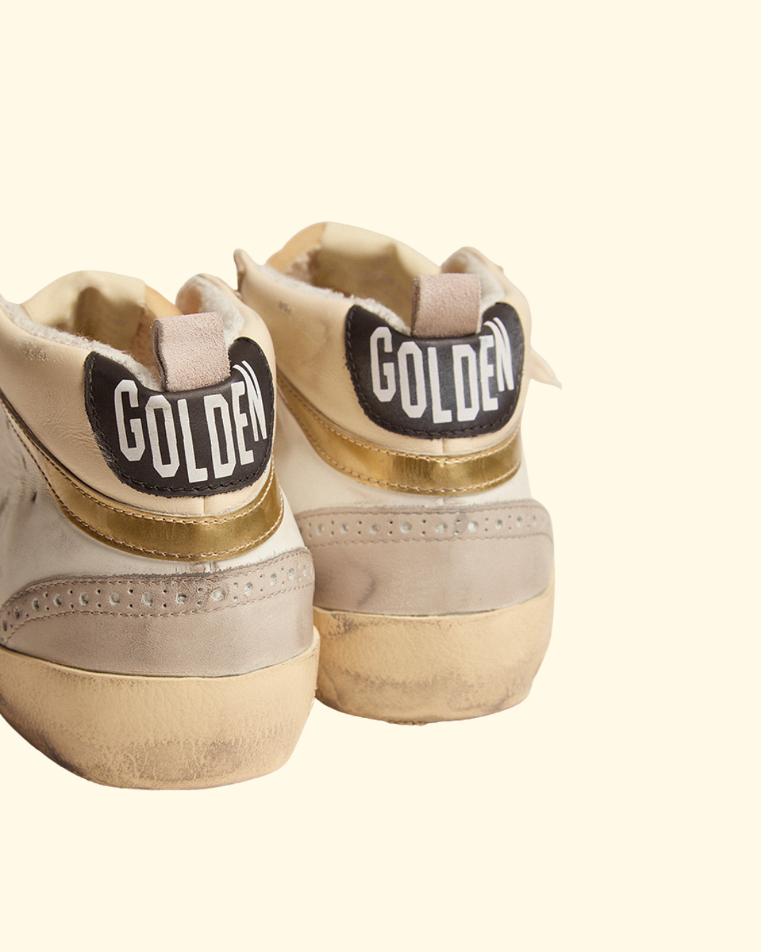 Uniquely elegant versatility: the Mid Star sneakers take a refined approach to their Nineties skate scene inspiration. These sneakers with a white and ivory leather upper, feature a light gray suede star and black leather heel tab. The chrome-effect gold leather flash and the insert with broguing complete the look.
