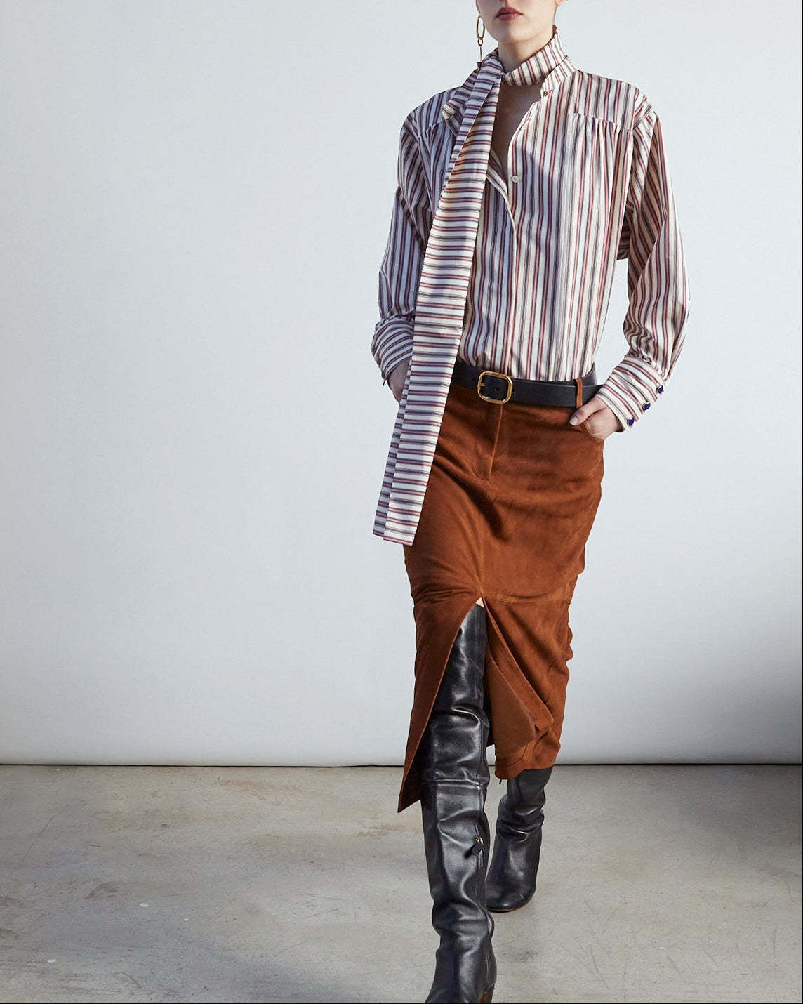Introducing the Ruth Skirt. A midi pencil skirt crafted from premium genuine brown suede, featuring side and back pockets and a front center slit for ease of movement and a sophisticated touch.