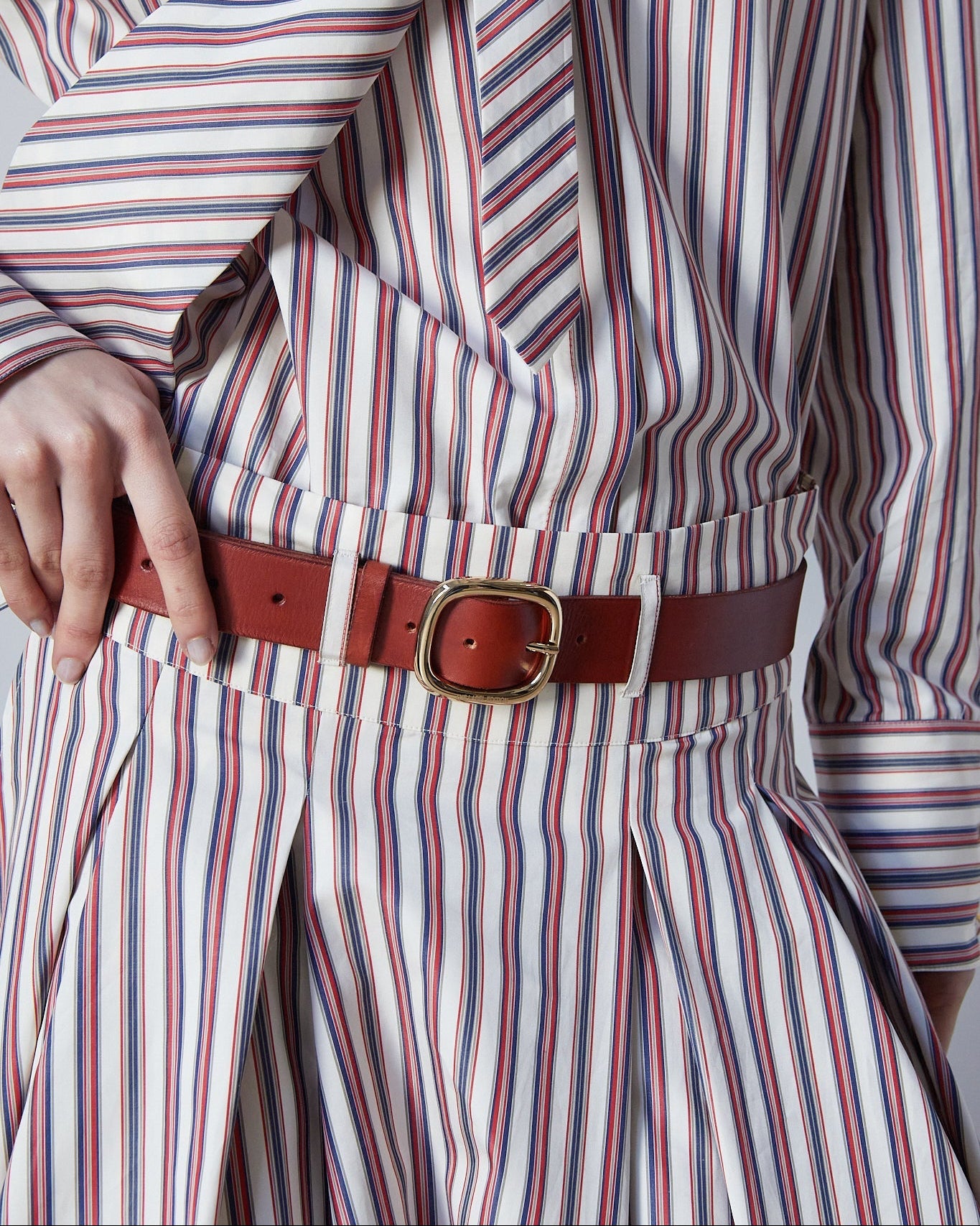 Introducing the Sidney Skirt. A midi skirt crafted from Portuguese premium fabric in stripes, finishing in angular points and moving gracefully with every step. Side-button closure for a polished finish.
