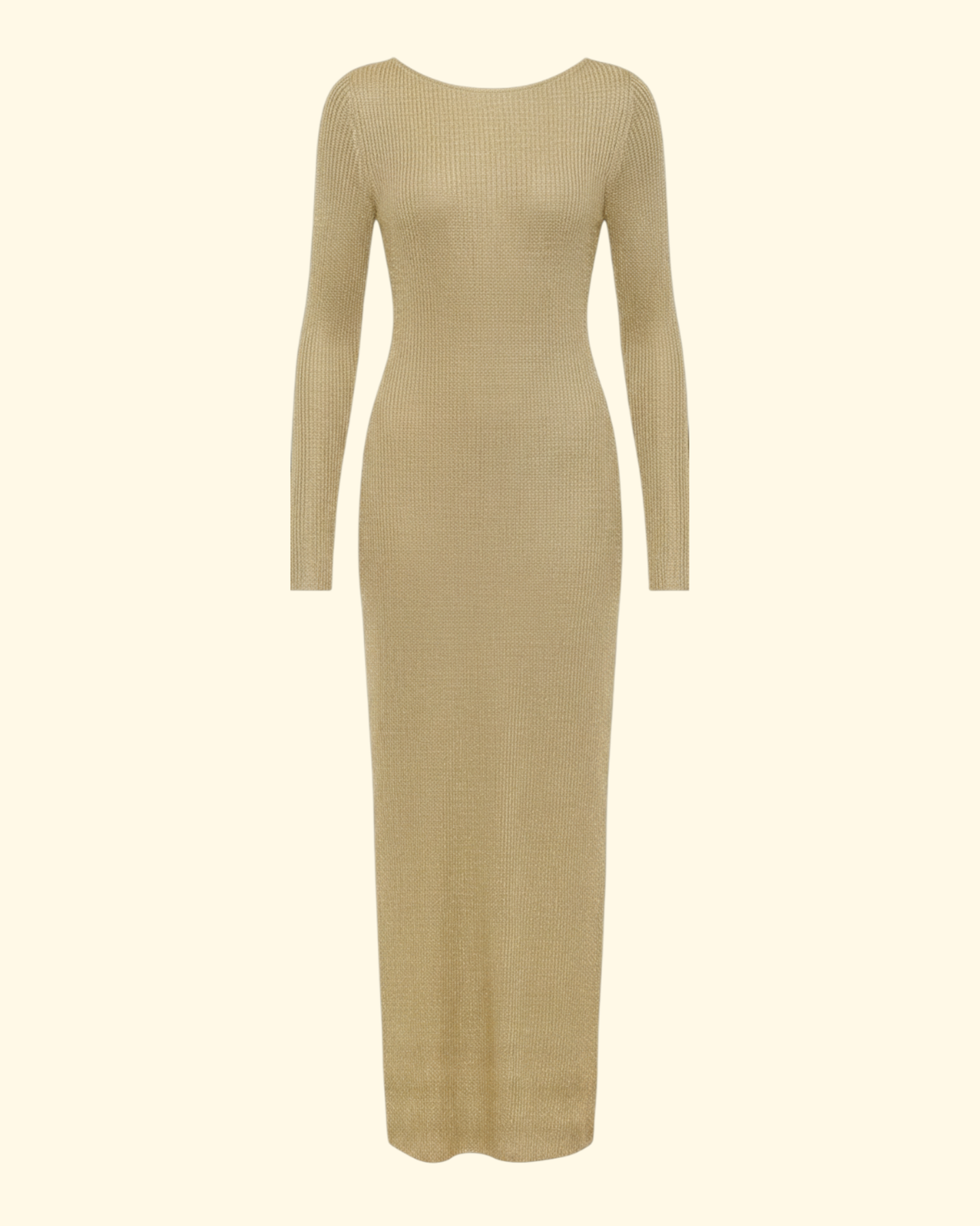 A long sleeve metallic knit dress perfect for any vacation occasion. The Nikitta features a fitted silhouette, low scoop back, and self-tie bow.