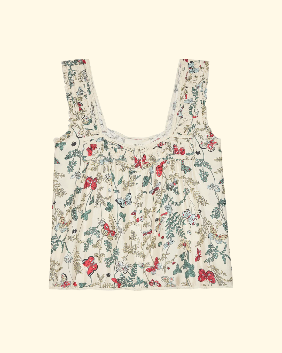 The Victorian Pleat Tank features pintuck and pleat detailing at the front and back neckline and shoulders, creating a refined, textured look. It has a square neckline trimmed with delicate cotton lace, a front button placket with shirting buttons, and scooped armholes with ruffle edges and a picot finish for added charm. The flowy silhouette is crafted from lightweight, silk twill and adorned with Spring’s Floating Butterfly Print.