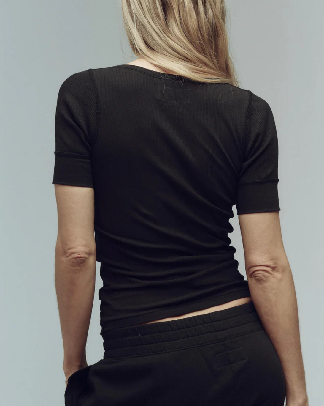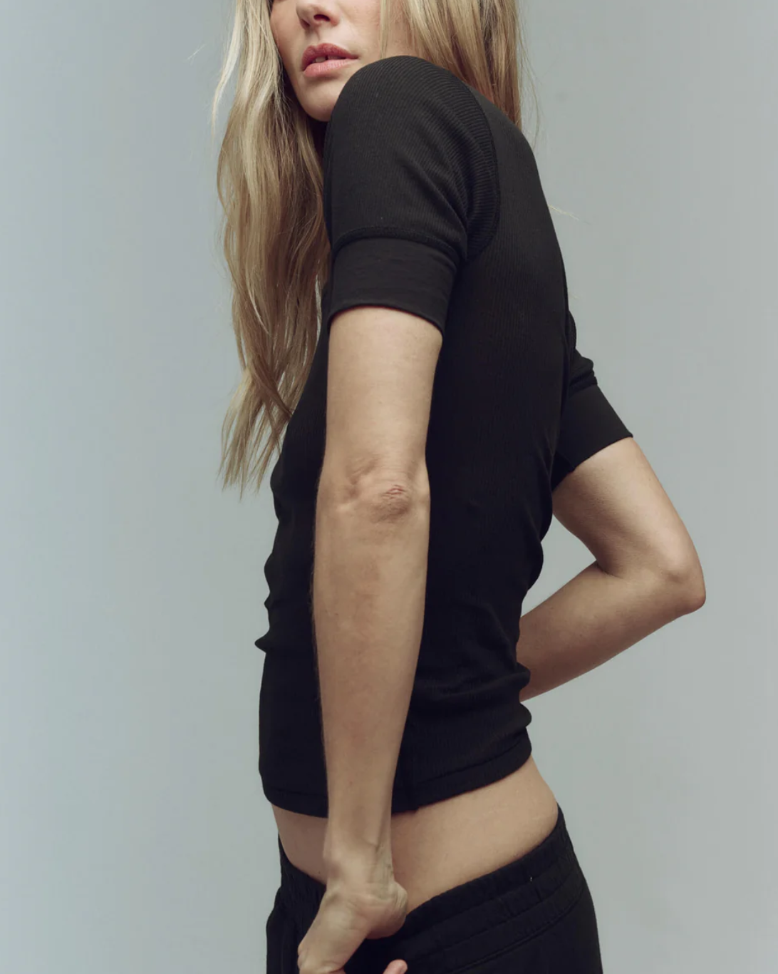 The Baby Rib Ballet Tee is a fresh take on vintage 1930s cotton undershirts, reimagined with a feminine edge. It features a scooped neckline with delicate binding, set-in short sleeves, and a wide, fine rib that adds structure and softness. Made from lightweight baby rib with a close-to-body fit and just the right amount of stretch, it’s as comfortable as it is timeless. Handcrafted in Los Angeles, ensuring no two pieces are exactly alike.