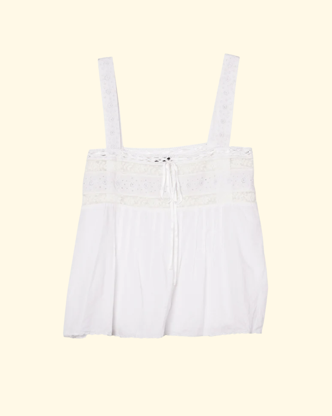 The Euri Top in White Embroidered Cotton is a women’s sleeveless top with lace detailing across the chest, embroidery along the hem, and tied with a ribbon bow in front.
