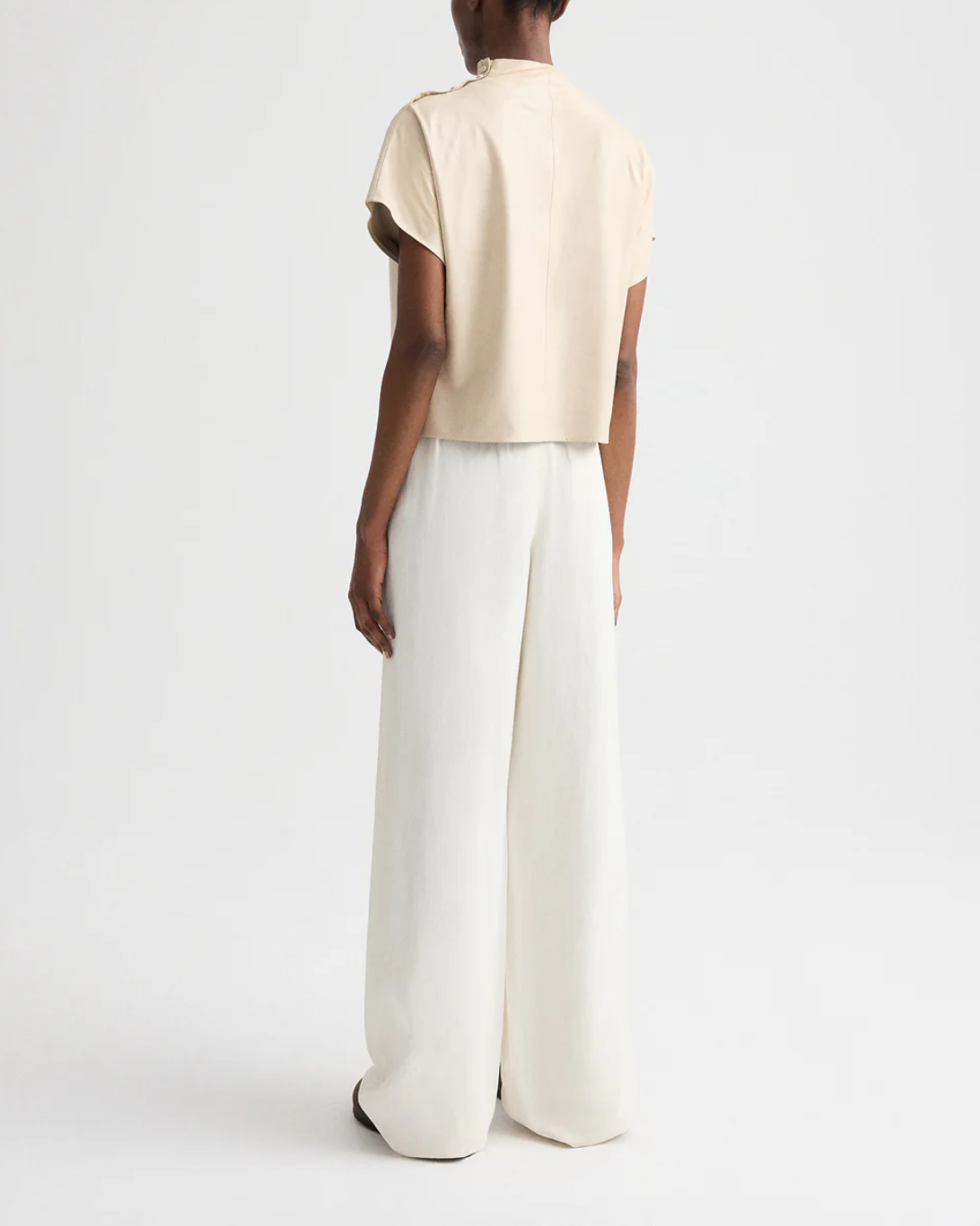 Short-sleeve mock-neck tee crafted in paper leather. Designed with an asymmetric front wrap detail and a relaxed, slightly boxy silhouette. Finished with a refined shoulder button closure, clean-cut sleeves, and subtle back seam detailing.