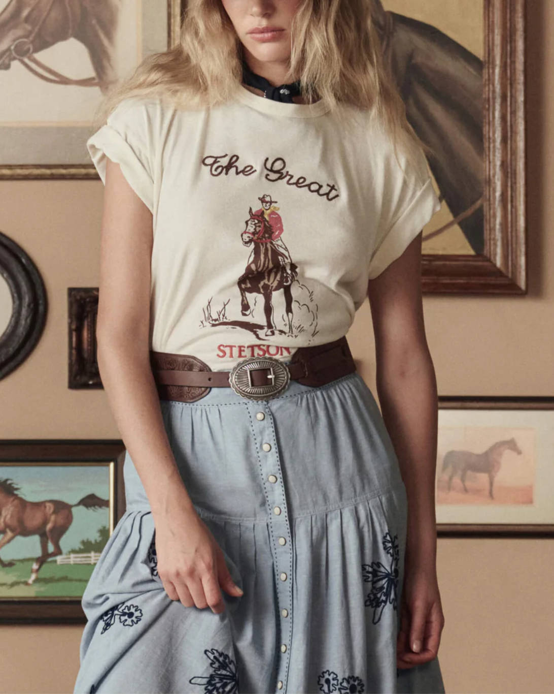 Inspired by a cherished vintage tee, the Boxy Crew is cut generously through the body with flattering updates like angled sleeves and a perfectly balanced length. Designed to become a go-to favorite, this style is made in collaboration with Stetson and The Great. It features their signature graphic, printed on soft jersey fabric with a slightly faded application and special embroidered accents that create a perfectly worn-in, vintage feel. Handcrafted locally in Los Angeles, each piece is unique, ensuring no two are alike.