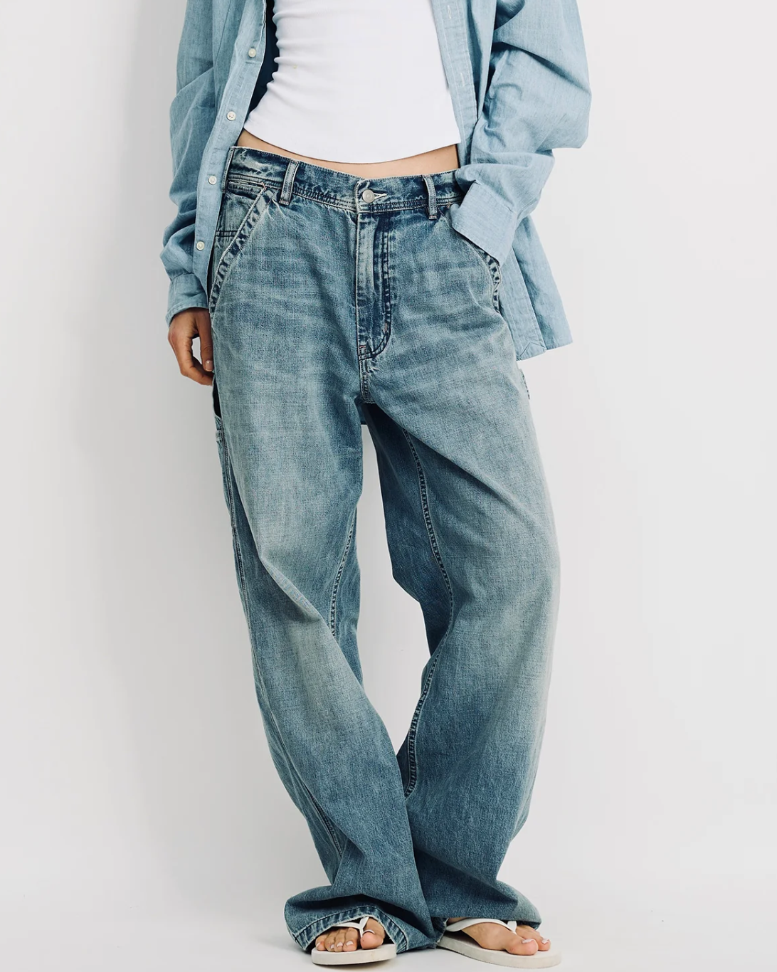Mid-rise with a relaxed fit and wide leg. Angled front patch pockets and visible side loop detail. Finished with subtle whiskering and a washed, broken-in texture.