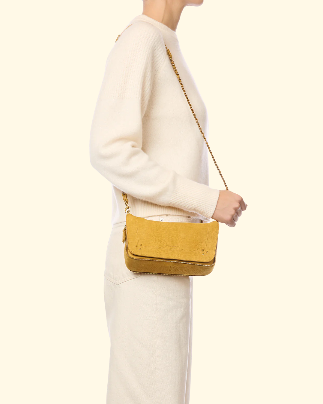 Shoulder bag, to wear over the shoulder or cross-body. Removable shoulder strap in braided leather chain. Closing by a flap in magnetized leather.
