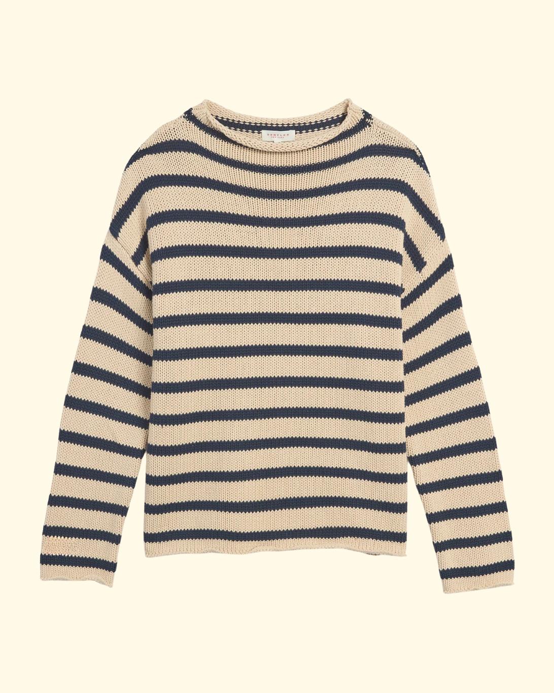 Slightly oversized mockneck pullover with allover sailor stripe. Relaxed fit with dropped shoulders. Rolled edges on neckline and hem.