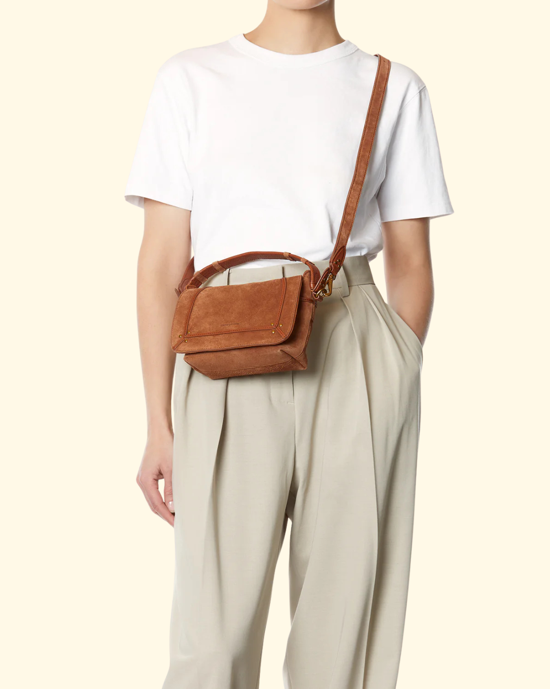 Shoulder bag, can be worn on the shoulder, crossbody, or by hand. It features a quilted leather handle and a long adjustable, removable strap. The closure is a magnetic leather flap adorned with stitched bands.