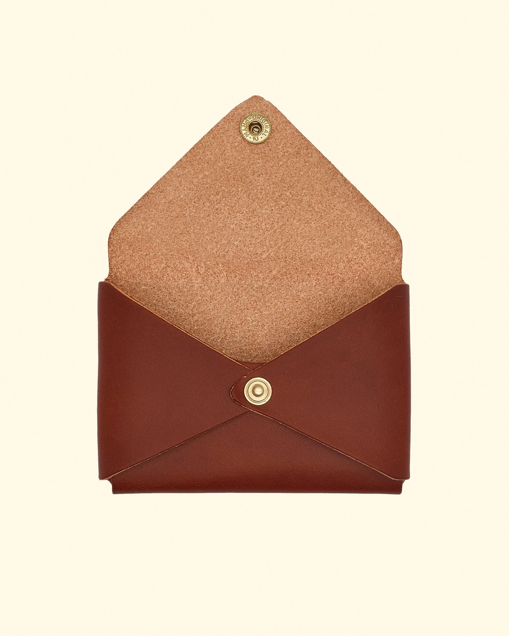 Unisex business card holder in vegetable tanned cowhide. Made in Italy by master craftsmen in Il Bisonte's 30 km supply chain. Envelope closure with brass snap button. Unlined.