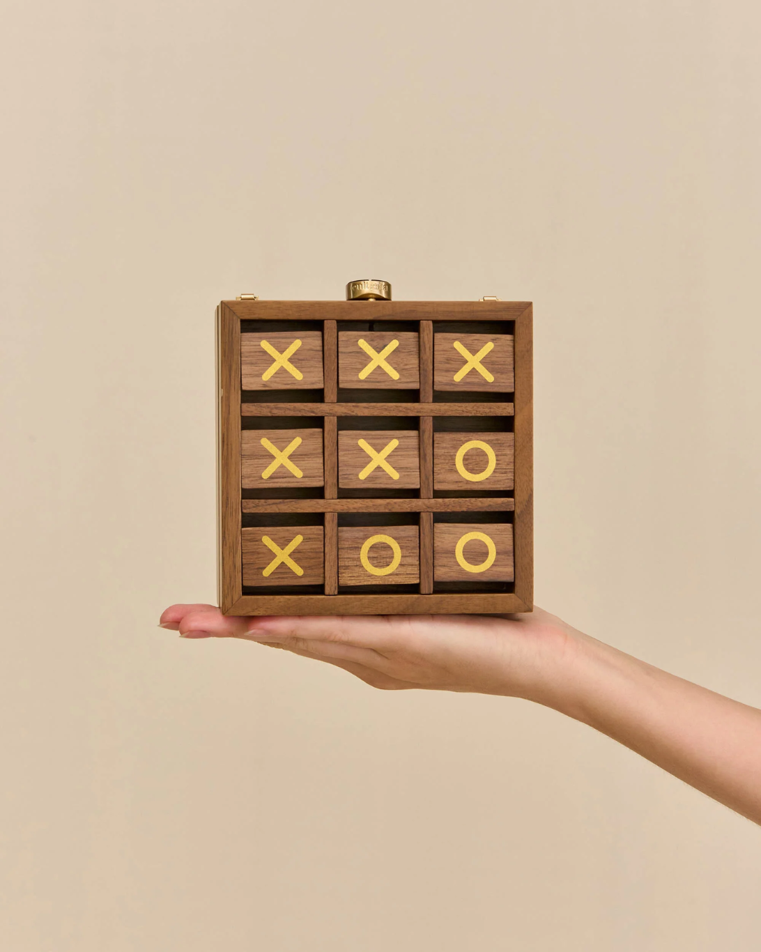 A playful wooden clutch that doubles as a portable game of tic tac toe.