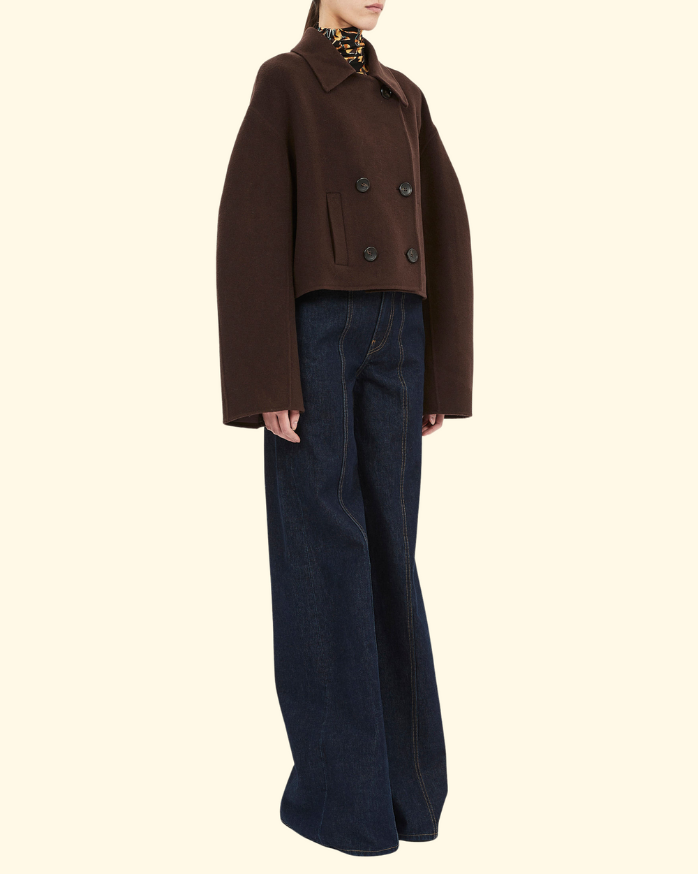 Ulla Johnson Marta cropped coat in double-faced wool, notch lapels, double-breasted front, dropped shoulders, oversized long sleeves and welt pockets. The coat features a relaxed fit and hem sits at the hip