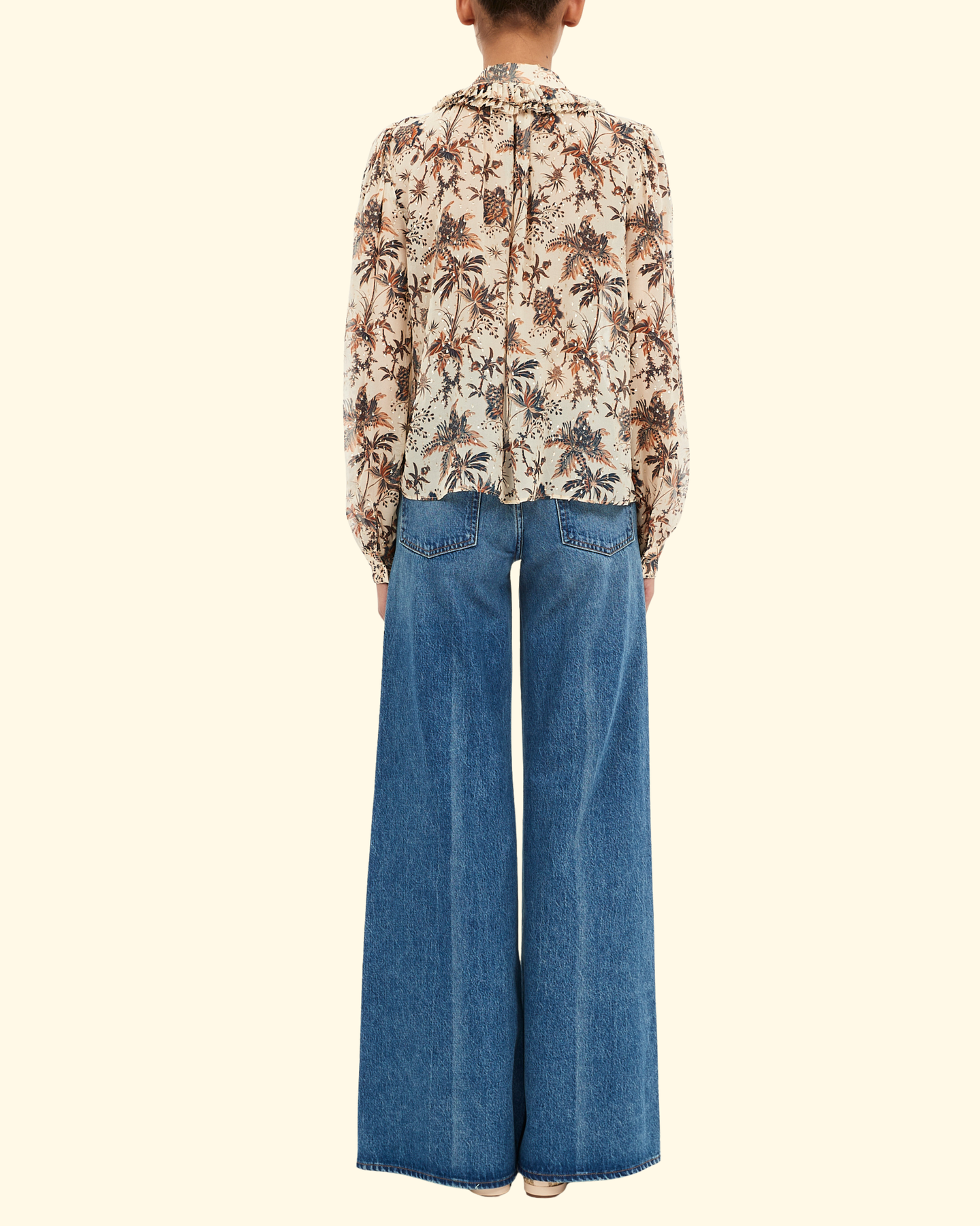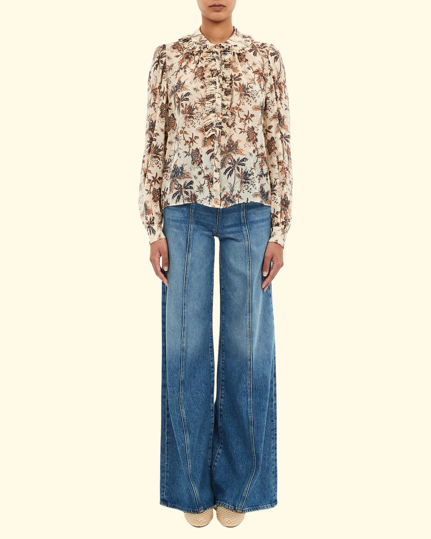 The Nina Blouse is adorned with palm florals and flickering dots atop a lightweight chiffon. This multicolored top is artfully puffed at the shoulders and finished with a burst of cascading, pleated ruffles.