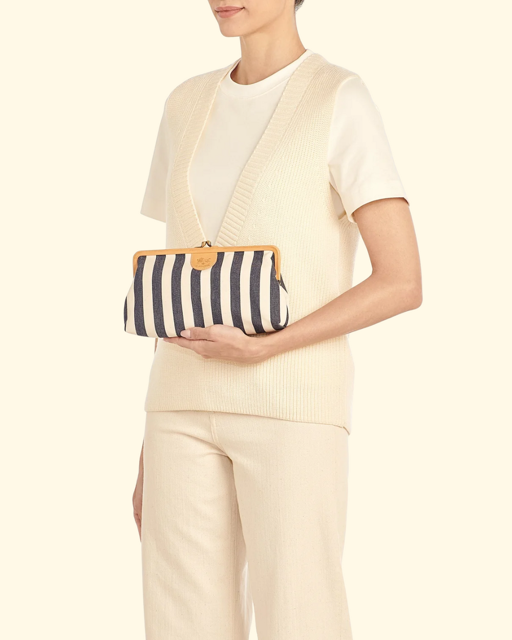 Crafted in Italy from premium vegetable-tanned leather, the Il Bisonte Classic Clutch features a bold stripe design in blue and natural tones. A timeless, minimalist silhouette with a secure closure—perfect for day-to-night use.