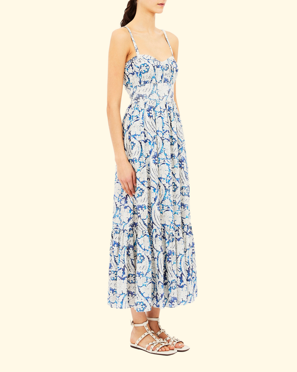 Inspired by a vintage indigo panel, the Nadine Dress is richly adorned with graphic florals against soft, tonal stripes. This multicolored sleeveless dress is made from a lightweight cotton-blend with a sweetheart neckline, fixed waist, and floats to a midi hemline. It fastens with a concealed side zipper.
